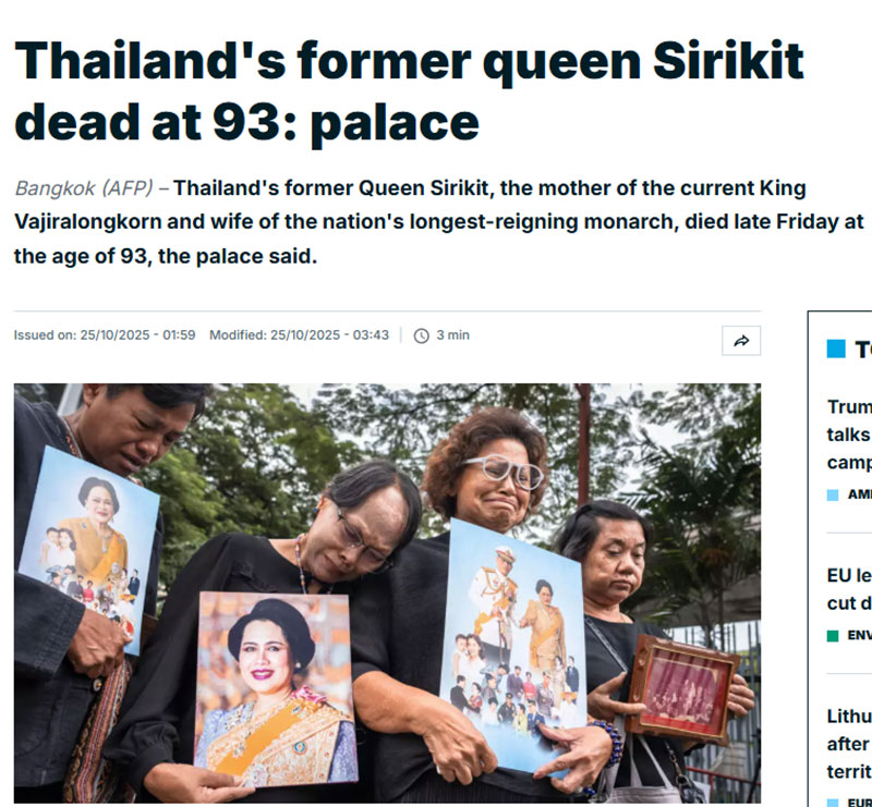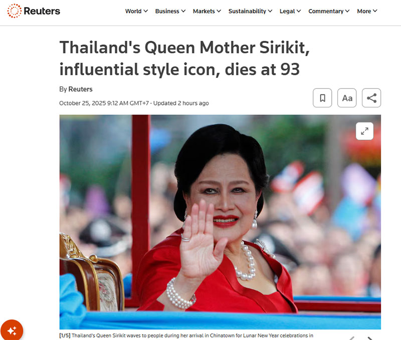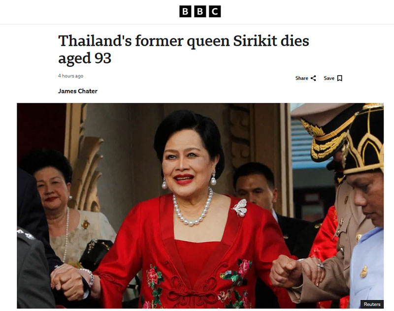 สำนักข่าวต่างประเทศ รายงานข่าว การสวรรคตของสมเด็จพระนางเจ้าสิริกิติ์ พระบรมราชินีนาถ พระบรมราชชนนีพันปีหลวง หรือ Queen Sirikit โดยอ้างแถลงการณ์สำนักพระราชวัง พร้อมเกร็ดพระราชประวัติในส่วนที่เป็นที่จดจำ เมื่อครั้งติดตามรัชกาลที่ 9 เสด็จประพาสต่างประเทศ
