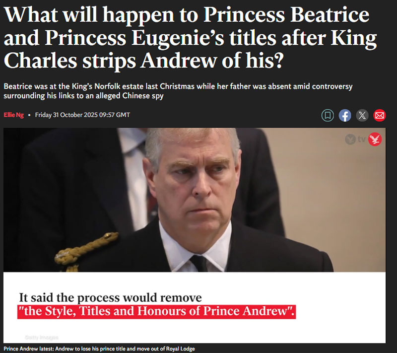 ความคืบหน้าล่าสุด สื่ออังกฤษ 'ดิ อินดิเพนเดนท์' ได้ออกมาเสนอข่าว "จะเกิดอะไรขึ้นกับตำแหน่งของเจ้าหญิงเบียทริซและเจ้าหญิงยูจีนี หลังจากกษัตริย์ชาร์ลส์ที่3ปลดเจ้าชายแอนดรูว์ออกจากตำแหน่ง?" โดยรายงานว่า ในฐานะพระธิดา ของพระราชโอรสของพระมหากษัตริย์ เจ้าหญิงเบียทริซ และ เจ้าหญิงยูจีนี จะยังคงดำรงพระอิสริยยศตามพระอิสริยยศของสมเด็จพระเจ้าจอร์จที่ 5 เมื่อปี ค.ศ.1917 เป็นที่เข้าใจกันว่าทั้ง 2 พระองค์ จะได้รับเชิญให้เข้าร่วมงานสังสรรค์ ที่ซานดริงแฮม ในช่วงคริสต์มาส และ งานกิจกรรมอื่นๆในราชวงศ์