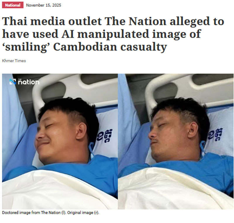 15 พฤศจิกายน 2568 สำนักข่าวขแมร์ ไทม์ส ของประเทศกัมพูชา รายงานว่า สำนักข่าวแห่งหนึ่งของประเทศไทย ดูเหมือนจะถูกจับได้คาหนังคาเขาจากการใช้เอไอ (AI) แต่งภาพพลเมืองกัมพูชาที่ได้รับบาดเจ็บจากเหตุการณ์ที่ทำให้พลเมืองกัมพูชาเสียชีวิต 1 ราย และบาดเจ็บ 3 ราย โดยฝีมือกองกำลังทหารของไทยในสัปดาห์นี้