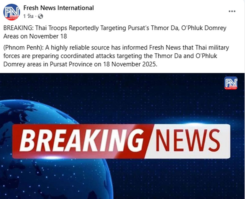 18 พฤศจิกายน 2568 หลังจากที่สื่อหลักของประเทศกัมพูชาอย่าง 'เฟรช นิวส์' (Fresh News) ได้ออกมารายงานข่าวว่า ทหารไทยกำลังเตรียมโจมตี พื้นที่จังหวัดโพธิสัตว์ ประเทศกัมพูชาในวันนี้ โดยระบุข้อความว่า "มีรายงานว่าทหารไทยโจมตีพื้นที่ในจังหวัดโพธิสัตว์ เมื่อวันที่ 18 พฤศจิกายน (พนมเปญ) : แหล่งข่าวที่เชื่อถือได้แจ้งกับ Fresh News ว่ากองทัพไทยกำลังเตรียมการโจมตีแบบประสานกันโดยกำหนดเป้าหมายพื้นที่พื้นที่ธมอดาและโอพลุกด็อมเร็ยในจังหวัดโพธิสัตว์ ในวันที่ 18 พฤศจิกายน 2568"