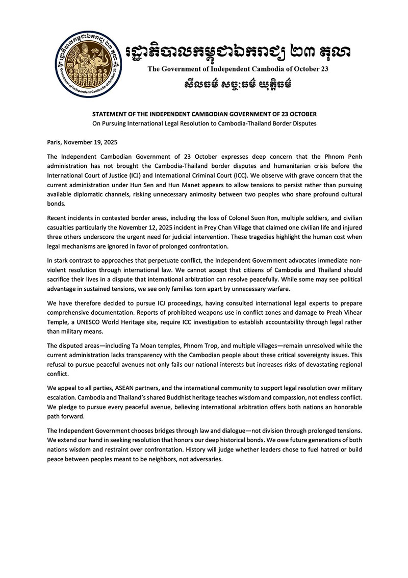 รัฐบาลกัมพูชาอิสระ ลงวันที่ 23 ตุลาคม แสดงความกังวลอย่างยิ่งว่ารัฐบาลพนมเปญไม่ได้นำข้อพิพาทชายแดนกัมพูชา-ไทยและวิกฤตด้านมนุษยธรรมขึ้นสู่ศาลยุติธรรมระหว่างประเทศ (ICJ) และศาลอาญาระหว่างประเทศ (ICC) เราสังเกตด้วยความกังวลอย่างยิ่งว่ารัฐบาลชุดปัจจุบันภายใต้ฮุนเซน และฮุน มาเนต ดูเหมือนจะปล่อยให้ความตึงเครียดคงอยู่ต่อไป แทนที่จะใช้ช่องทางการทูตที่มีอยู่ ซึ่งเสี่ยงต่อความขัดแย้งที่ไม่จำเป็นระหว่างสองประเทศที่มีสายสัมพันธ์ทางวัฒนธรรมที่ลึกซึ้ง