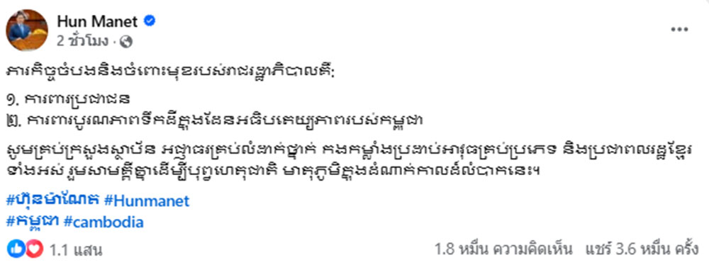 8 ธันวาคม 2568 นายกรัฐมนตรีฮุน มาเนต ได้ออกมาโพสต์ข้อความบนเฟซบุ๊ก 'Hun Manet' ที่มีผู้ติดตาม 2.4 ล้านคน ประกาศว่า ภารกิจเร่งด่วนของรัฐบาลกัมพูชาตอนนี้ คือ ปกป้องประชาชน และปกป้องบูรณภาพแห่งดินแดนอธิปไตยของกัมพูชา