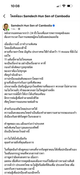 9 ธันวาคม 2568 ฮุน เซน ประธานวุฒิสภากัมพูชา โพสต์ข้อความบนเฟซบุ๊กส่วนตัว อ้างว่ากัมพูชาตัดสินใจตอบโต้เพิ่มเติมแล้ว หลังอดทนมากว่า 24 ชั่วโมง เนื่องจากไทยเปิดปฏิบัติการทวงคืนอธิปไตยและตอบโต้การโจมตีจากฝ่ายกัมพูชา