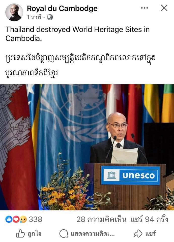 เมื่อวันที่ 11 ธ.ค.2568 เพจเฟซบุ๊ก "ASEAN “มอง” ไทย" ได้โพสต์ภาพแคปโพสต์เฟซบุ๊กของสมเด็จพระนโรดมสีหมุนี พระมหากษัตริย์กัมพูชา ระบุว่า "ประเทศไทยทำลายมรดกโลกของกัมพูชา" โดยระบุข้อความเพิ่มเติมว่า "เพจ Royal du Cambodge ซึ่งเป็นที่ทราบกันดีว่าเป็นเพจของสมเด็จพระนโรดมสีหมุนี พระมหากษัตริย์กัมพูชา ได้โพสต์ว่าประเทศไทยทำลายมรดกโลกของกัมพูชา แต่ไม่บอกสักคำว่าใช้ปราสาทพระวิหารเป็นสถานที่ใช้ในทางการทหารของกัมพูชา