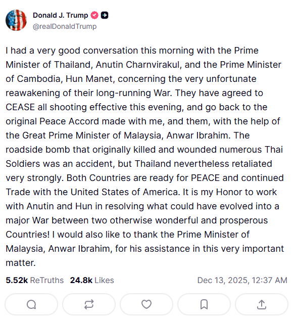 โดย ทรัมป์ ระบุว่า ได้สนทนากับนายกฯ ของไทย นายอนุทิน ชาญวีรกูล และนายกรัฐมนตรีของกัมพูชา นายฮุน มาเนต ถึงการปะทุขึ้นของเหตุปะทะที่ยืดเยื้อมานาน พวกเขาตกลงที่จะหยุดยิงทั้งหมดในเย็นวันนี้ และ กลับเข้าสู่ปฏิญญาสันติภาพฉบับเดิม ด้วยความช่วยเหลือจาก นายกฯ อันวาร์ อิบราฮิม ของมาเลเซีย