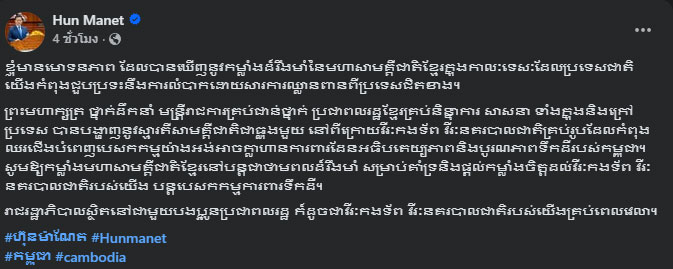 ขอให้พลังแห่งความสามัคคีของชาติชาวกัมพูชายังคงเป็นพลังอันแข็งแกร่งต่อไป เพื่อสนับสนุนและเป็นกำลังใจให้แก่วีรชนกองทัพและวีรชนตำรวจแห่งชาติของเรา ในการเดินหน้าปฏิบัติภารกิจปกป้องผืนแผ่นดิน รัฐบาลพร้อมยืนหยัดอยู่เคียงข้างพี่น้องประชาชน รวมถึงวีรชนกองทัพและวีรชนตำรวจแห่งชาติของเราในทุกเวลา"