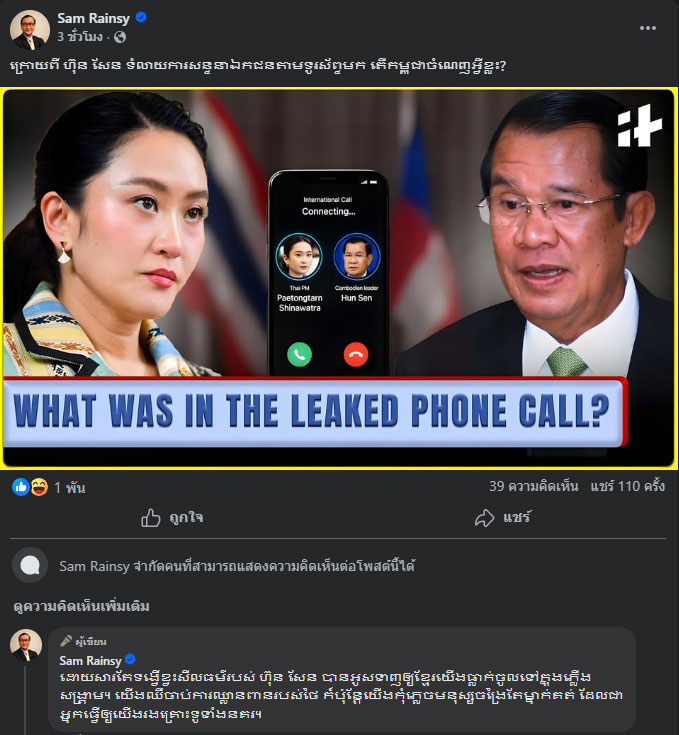 พร้อมทั้งเขียนข้อความในคอมเมนต์เพิ่มเติมอีกว่า “เนื่องจากการกระทำที่ไร้ศีลธรรมของ ฮุน เซน ได้ลากพาชาวเขมรของเราตกเข้าสู่สงคราม เราเจ็บปวดจากการรุกรานของไทยก็จริง แต่ขออย่าลืมคนชั่วเพียงคนเดียว ที่เป็นผู้ทำให้เราทุกคนต้องตกเป็นเหยื่อไปทั่วทั้งประเทศ”