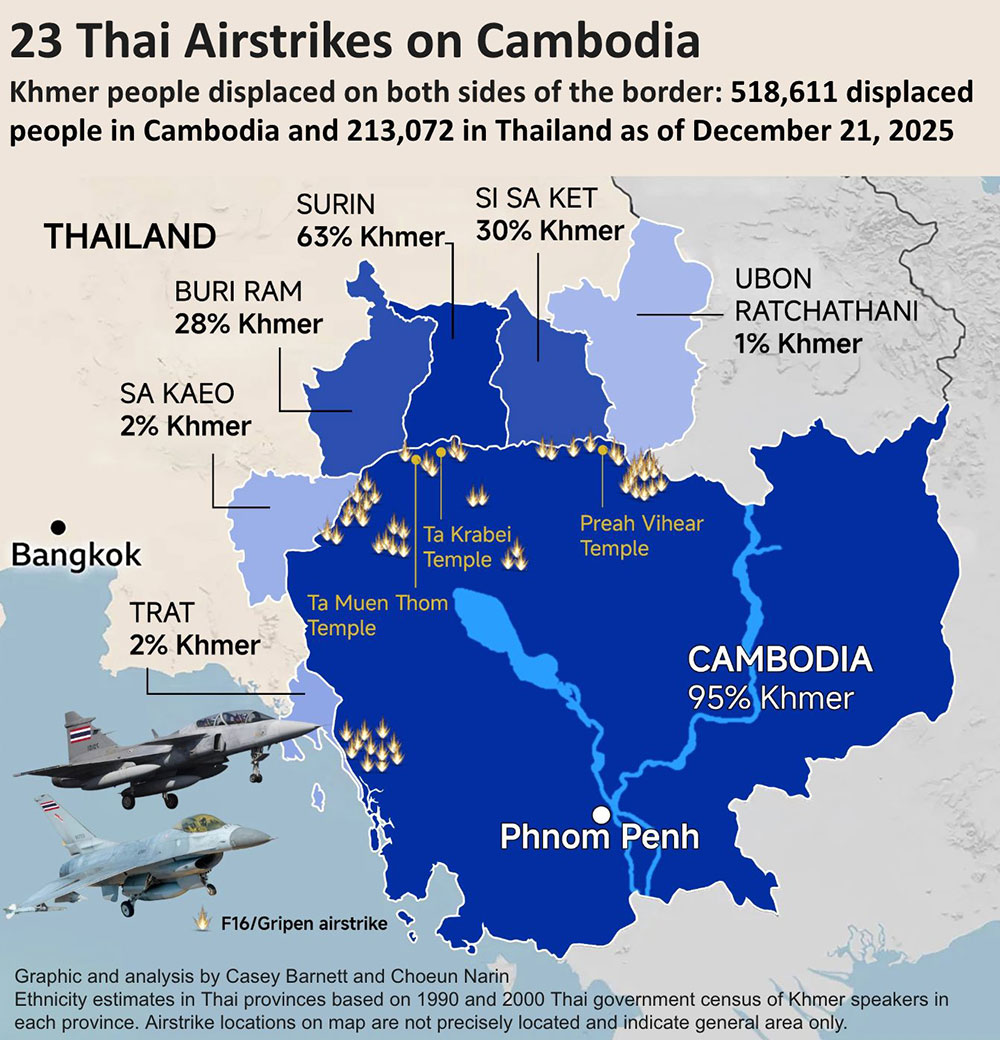 พร้อมกันนี้ 'เคซีย์ บาร์เน็ตต์' ได้โพสต์ภาพของแผนที่ของทั้งไทยและกัมพูชาแสดงให้เห็นว่าการทิ้งระเบิดอยู่ในเขตอธิปไตยของกัมพูชา เขาบอกว่า กัมพูชาไม่ได้ตอบโต้การโจมตีทางอากาศของไทย เนื่องจากกัมพูชาไม่มีเครื่องบินรบหรือระบบป้องกันภัยทางอากาศของตนเอง กัมพูชาไม่มีทางเลือกอื่นนอกจากต้องรับการทิ้งระเบิด ซึ่งส่งผลให้ชาวกัมพูชา 518,611 ครอบครัว เด็ก และผู้สูงอายุต้องพลัดถิ่น และอาศัยอยู่ในเต็นท์ชั่วคราวในค่ายผู้ลี้ภัย