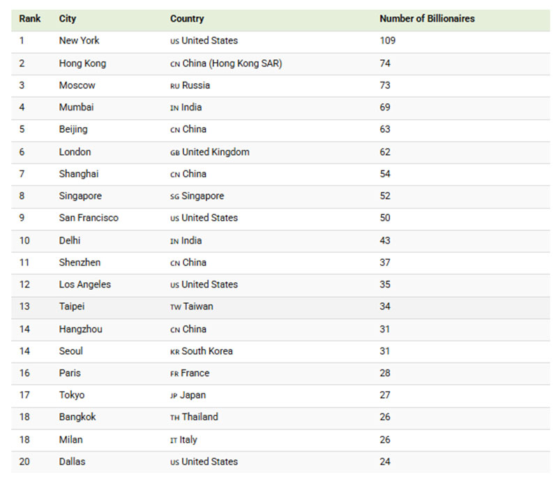 มหานครนิวยอร์ก ครองอันดับหนึ่งด้วยคะแนนนำห่าง โดยมีมหาเศรษฐีถึง 109 คนอาศัยอยู่ในเมืองนี้ ความโดดเด่นของเมืองนี้สะท้อนให้เห็นถึงความเป็นผู้นำด้านการเงิน เงินหมุนเวียนของเงินทุนทั่วโลก และการกระจุกตัวอย่างหนาแน่นของบริษัทลงทุน ความมั่งคั่งด้านอสังหาริมทรัพย์ และสำนักงานใหญ่ของบริษัทต่างๆ ในหลายทศวรรษ แม้แต่ 'ฮ่องกง' ซึ่งอยู่ในอันดับสองก็ยังตามหลังนิวยอร์กอยู่มากกว่า 30 คน และอันดับ 3 กรุงมอสโก ของประเทศรัสเซีย มีมหาเศรษฐี อยู่ 73 คน