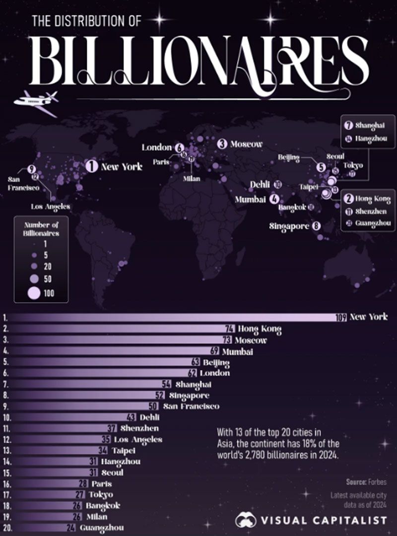 22 ธันวาคม 2568 สำนักข่าวต่างประเทศรายงานว่า เว็บไซต์ Visual Capitalist สื่อที่นำเสนอข้อมูลด้านเศรษฐกิจ เทคโนโลยี รวมถึงพลังงาน ได้ออกมาจัดอันดับ 20 เมืองที่มีมหาเศรษฐีมากที่สุดในโลก การจัดอันดับล่าสุดจากข้อมูลของ Forbes รายงานให้เห็นว่าเมืองใหญ่ทั่วโลกกำลังกลายเป็นแหล่งรวมของ "มหาเศรษฐี" ระดับพันล้านดอลลาร์