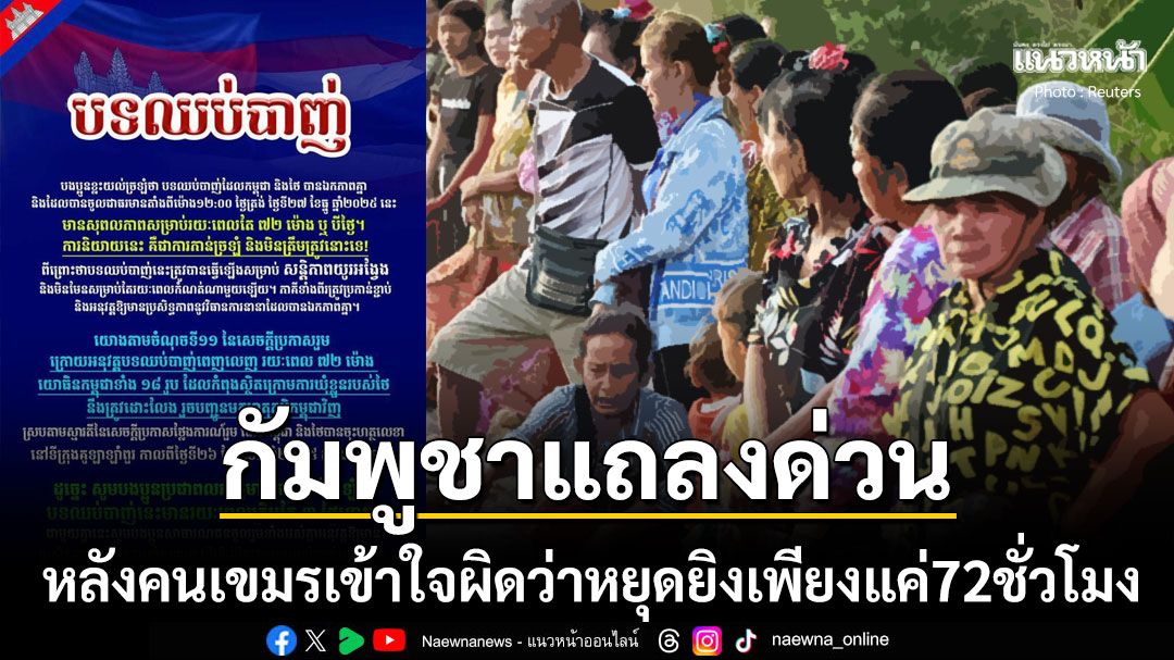 กระทรวงสารสนเทศแห่งราชอาณาจักรกัมพูชา ออกแถลงการณ์ ระบุว่า บางคนเข้าใจผิดว่า การหยุดยิงที่กัมพูชาและไทยตกลงกันและมีผลบังคับใช้ตั้งแต่เวลา 12.00 น. ของวันที่ 27 ธ.ค. 68 นั้นมีผลเพียง 72 ชั่วโมงหรือ 3 วันเท่านั้น ข้อความนี้ไม่ถูกต้องและทำให้เข้าใจผิด! การหยุดยิงนี้มีจุดประสงค์เพื่อสันติภาพในระยะยาว ไม่ใช่เพียงช่วงเวลาจำกัด ทั้งสองฝ่ายต้องปฏิบัติตามและดำเนินการตามมาตรการที่ตกลงกันไว้อย่างมีประสิทธิภาพ
