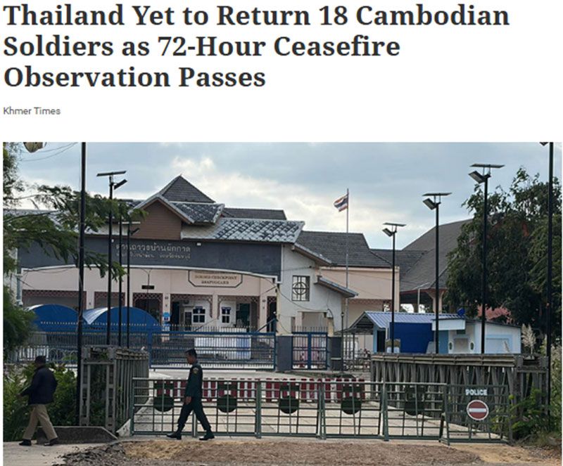 30 ธันวาคม 2568 สำนักข่าวต่างประเทศรายงานว่า บัน สเร มอม ผู้ว่าราชการจังหวัดไพลินของกัมพูชา ระบุว่า ทางการจังหวัดไพลินยังไม่ได้รับข้อมูลใด ๆ เกี่ยวกับที่อยู่หรือการกลับมาของทหารกัมพูชา 18 นายที่ถูกไทยควบคุมตัวไว้ แม้ว่าระยะเวลาการสังเกตการณ์หยุดยิง 72 ชั่วโมงจะผ่านไปแล้วก็ตาม