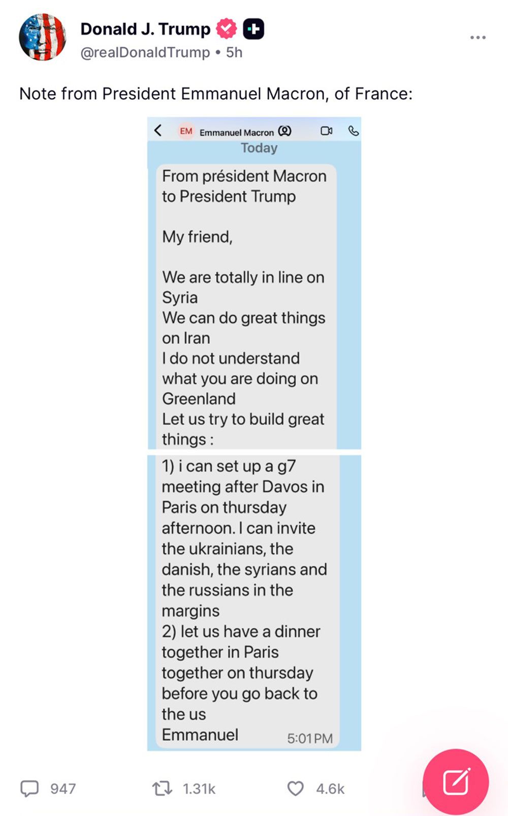ซึ่งภาพจากแชตของ 2 ประธานาธิบดีมีใจความว่า "จากประธานาธิบดีมาครงถึงประธานาธิบดีทรัมป์ เรามีความเห็นตรงกันเกี่ยวกับซีเรีย เราสามารถทำสิ่งที่ดีเยี่ยมเกี่ยวกับอิหร่านได้ ผมไม่เข้าใจว่าคุณกำลังทำอะไรเกี่ยวกับกรีนแลนด์"