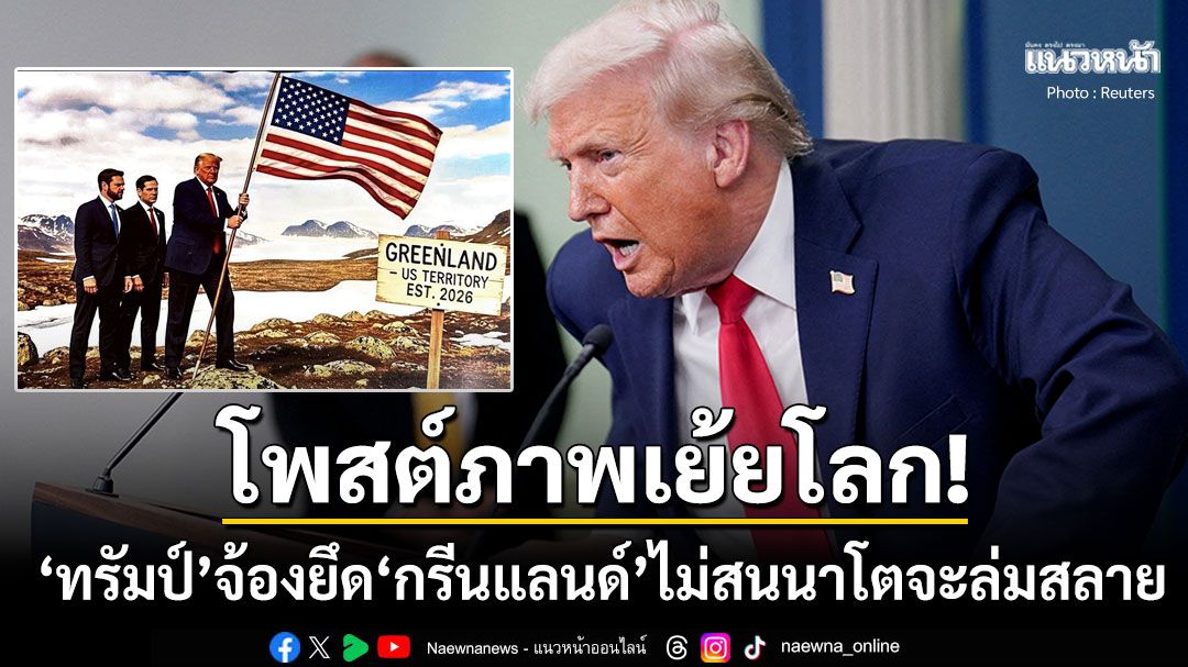 ด้าน 'ทรัมป์' ไม่ลดละ เดินหน้าแคมเปญผนวกกรีนแลนด์ผ่านแพลตฟอร์มทรูธโซเชียล ด้วยการโพสต์ภาพตัดต่อของตนเองกำลังปักธงบนน้ำแข็ง พร้อมป้ายที่เขียนว่า "กรีนแลนด์ – ดินแดนของสหรัฐอเมริกา ก่อตั้งในปี 2026" (GREENLAND – US TERRITORY EST. 2026) แม้เขาจะอ้างว่าการเข้าควบคุมกรีนแลนด์เป็นไปเพื่อปกป้องจากภัยคุกคามของรัสเซียและจีนก็ตาม