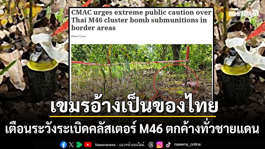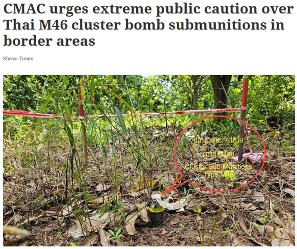 27 มกราคม 2569 สำนักข่าวแขมร์ ไทมส์ ได้รายงานว่า ศูนย์ปฏิบัติการด้านทุ่นระเบิดแห่งกัมพูชา (CMAC) ได้ออกคำเตือนเร่งด่วนเรียกร้องให้ประชาชนที่อาศัยอยู่ในจังหวัดต่างๆ ตามแนวชายแดนกัมพูชา-ไทย ระมัดระวังเป็นพิเศษเกี่ยวกับลูกระเบิดคลัสเตอร์ M46 ที่กองทัพไทยใช้ในดินแดนกัมพูชา