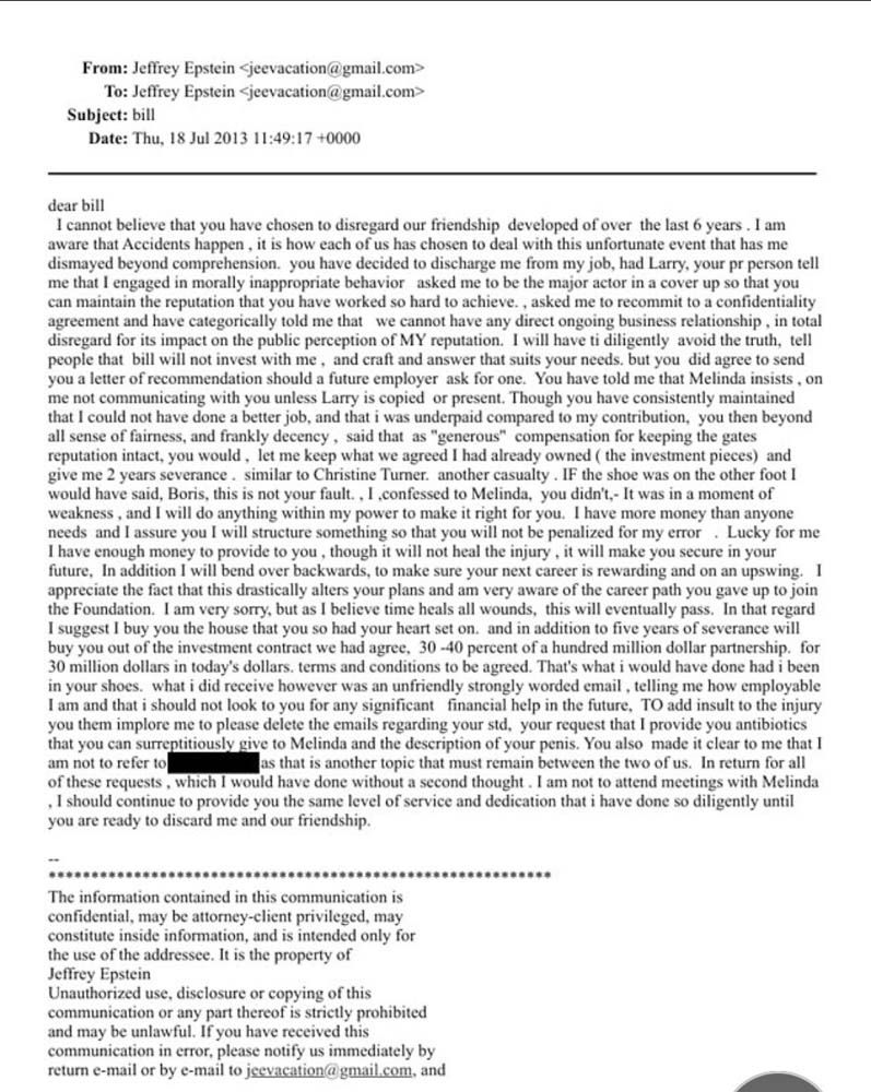 อีเมลฉบับหนึ่งถูกเขียนเหมือนเป็นจดหมายลาออกจากมูลนิธิบิลแอนด์เมลินดาเกตส์ และมีการร้องเรียนว่าผู้เขียนต้องจัดหายาให้ 'บิล เกตส์' เพื่อจัดการกับผลที่ตามมาจากการมีเพศสัมพันธ์กับสาวรัสเซีย ส่วนอีกฉบับขึ้นต้นด้วยคำว่า dear Bill มีถ้อยความแสดงความไม่พอใจที่เกตส์ตัดสัมพันธ์ และยังอ้างว่า 'บิล เกตส์' พยายามปกปิดเรื่องการติดโรคจากเพศสัมพันธ์ เพื่อไม่ให้ 'เมลินดา' ภรรยาของ 'บิล เกตส์' ในขณะนั้นได้รับรู้