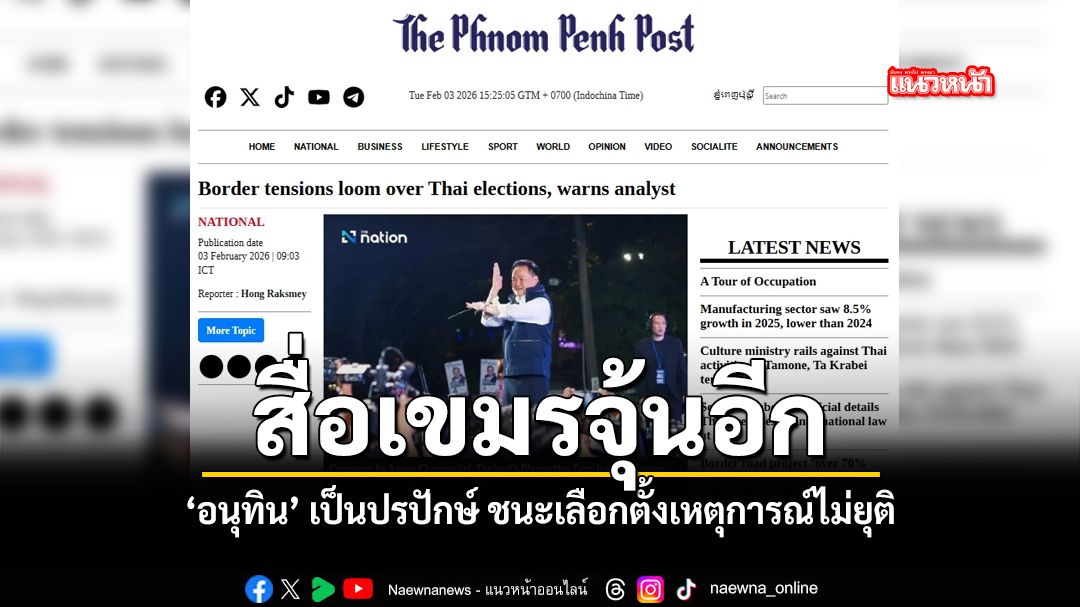 วันนี้ 3 กุมภาพันธ์ 2569 สื่อของกัมพูชาอย่าง เดอะ พนมเปญโพสต์ รายงานปฏิกิริยาอันร้อนแรงจากฝั่งกัมพูชา ต่อถ้อยแถลงหาเสียงของ นายอนุทิน ชาญวีรกูล หัวหน้าพรรคภูมิใจไทย โดยนักวิชาการระดับสูงของกัมพูชาแสดงความกังวลว่า นโยบายชาตินิยมสุดโต่งอาจกลายเป็นอุปสรรคสำคัญต่อความสัมพันธ์ระหว่างประเทศหากนายอนุทินก้าวขึ้นสู่ตำแหน่งผู้นำ