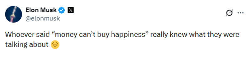6 กุมภาพันธ์ 2569 สำนักข่าวต่างประเทศรายงานว่า อีลอน มัสก์ มหาเศรษฐีอันดับ 1 ของโลก เจ้าของบริษัทเทสลา และ สเปซเอ็กซ์ รวมถึงแพลตฟอร์ม เอ็กซ์ (X) ได้ออกมาโพสต์ข้อความผ่านแพลตฟอร์มเอ็กซ์ส่วนตัว "@elonmusk" ระบุข้อความระบายความในใจ "Whoever said “money can’t buy happiness” really knew what they were talking about " (ใครก็ตามที่เคยพูดว่า 'เงินซื้อความสุขไม่ได้' พวกเขาเหล่านั้นรู้ซึ้งถึงสิ่งที่พูดจริงๆ) พร้อมอิโมจิหน้าเศร้า