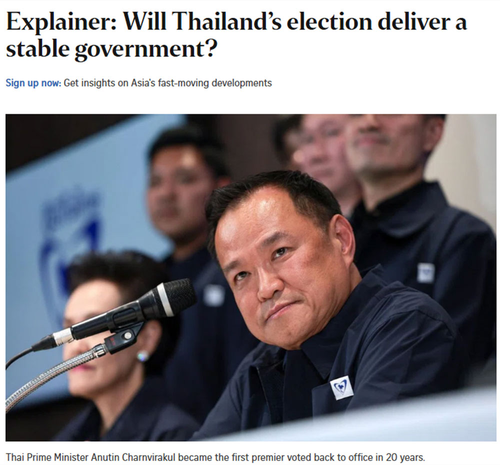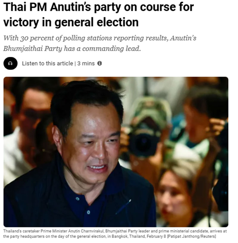 สำนักข่าว อัลจาซีรา (Aljazeera) สื่อของอาหรับ รายงานว่า พรรคของนายกรัฐมนตรีอนุทินมีแนวโน้มคว้าชัยชนะในการเลือกตั้งทั่วไป พรรคภูมิใจไทย ซึ่งเป็นพรรครัฐบาลของไทยกำลังมุ่งหน้าสู่ชัยชนะในการเลือกตั้งทั่วไปที่จัดขึ้นก่อนกำหนด ทำให้ นายกรัฐมนตรี อนุทิน ชาญวีรกุล มีอำนาจต่อรองเหนือกว่าในการจัดตั้งรัฐบาลผสมชุดใหม่