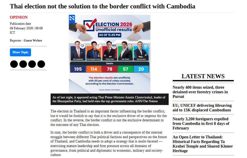 9 กุมภาพันธ์ 2569 สำนักข่าว พนมเปญ โพสต์ สื่อหลักของประเทศกัมพูชา พาดหัวข่าววันนี้ว่า "การเลือกตั้งของไทยไม่ใช่ทางออกของความขัดแย้งชายแดนกับกัมพูชา" พร้อมระบุเนื้อข่าวว่า