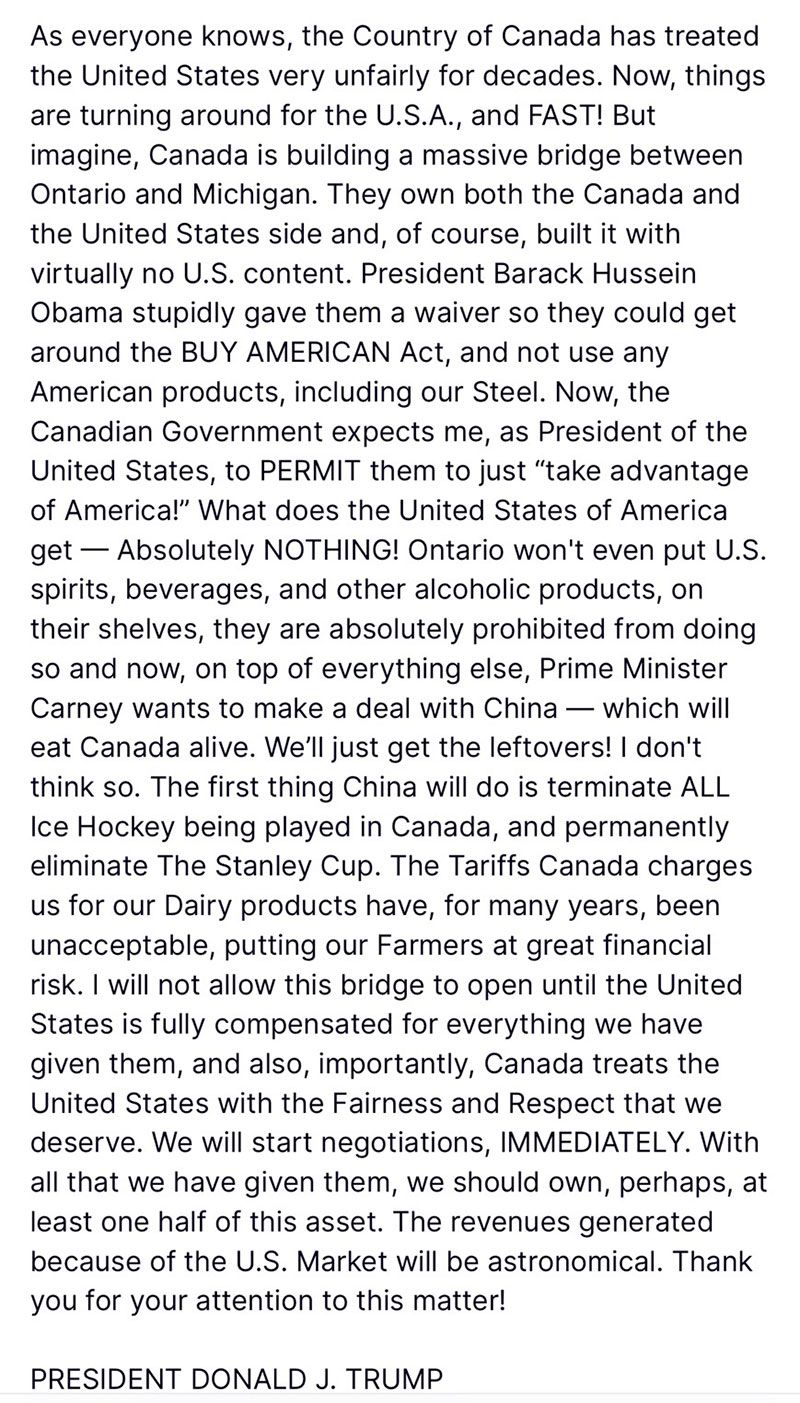 ต่อมา 'ทรัมป์' ได้ออกมาโพสต์ข้อความผ่านทาง ทรูธ โซเชียล ส่วนตัว "@RealDonaldTrump" ว่าสหรัฐจะไม่อนุญาตให้สะพานแห่งนี้เปิดใช้งานจนกว่าจะได้รับการชดเชยอย่างเต็มรูปแบบสำหรับทุกสิ่งที่เคยได้มอบให้แก่แคนาดา และเน้นย้ำความสำคัญว่าแคนาดาต้องปฏิบัติต่อสหรัฐด้วยความเป็นธรรมและให้เกียรติอย่างที่ควรได้รับ โดยเสนอว่าสหรัฐควรมีส่วนร่วมเป็นเจ้าของในสะพานแห่งนี้อย่างน้อยกึ่งหนึ่งจากมูลค่าการสนับสนุนที่เคยให้แก่แคนาดามาโดยตลอด
