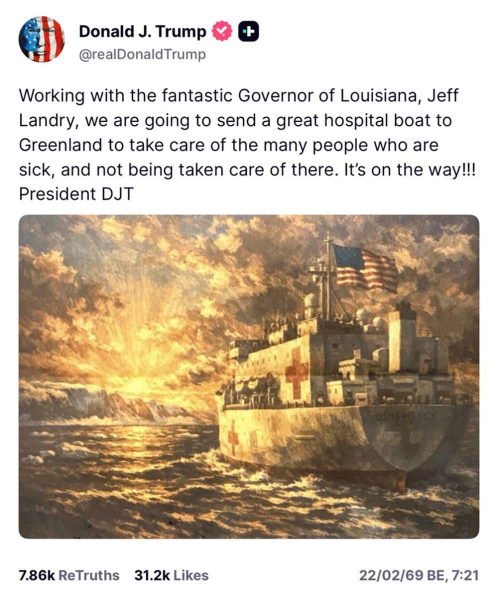 'ทรัมป์' ระบุข้อความผ่านทาง ทรูธ โซเชียล @realDonaidTrump ส่วนตัวว่า "ตนทำงานร่วมกับ เจฟฟ์ แลนดรี ผู้ว่าการรัฐลุยเซียนา และขณะนี้เรือพยาบาลลำใหญ่กำลังเดินทางไปยังกรีนแลนด์ เพื่อดูแลผู้คนจำนวนมากที่กำลังป่วย และไม่ได้รับการดูแลที่นั่น ตอนนี้กำลังอยู่ระหว่างทางแล้ว - โดนัลด์ เจ ทรัมป์ "