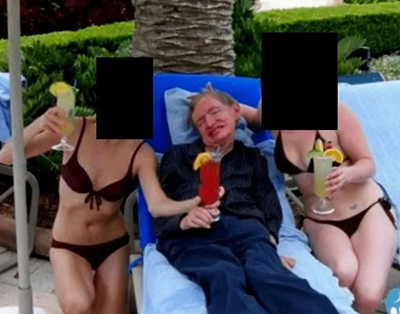 โดยภาพที่เป็นที่ฮือฮาในสื่อต่างประเทศคือภาพของ 'ศาสตราจารย์สตีเฟน ฮอว์กิง' (Stephen Hawking) นักฟิสิกส์ผู้เป็นอัจฉริยะร่วมสมัยที่ได้รับการยกย่องจากทั่วโลก ที่ถูกกระทรวงยุติธรรมเผยแพร่ออกมา ซึ่งเป็นภาพที่ 'สตีเฟน ฮอว์กิง' สวมเสื้อผ้าครบนอนยิ้มแย้มอยู่ท่ามกลางหญิงสาวในชุดบิกินีที่ถูกปิดบังใบหน้าบนเก้าอี้ชายหาดริมสระว่ายน้ำ โดยในมือของทุกคนถือเครื่องดื่มค็อกเทล
