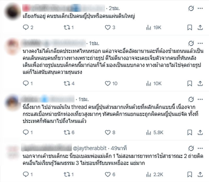 - นี่อึ้งมาก ไปอ่านเม้นใน thread คนญี่ปุ่นส่วนมากเห็นด้วยที่ผลักเด็กแบบนี้ เนื่องจากกระแสเบื่อหน่ายนักท่องเที่ยวสูงมากๆ ทัศนคติการแยกแยะถูกผิดคนญี่ปุ่นแย่จัด ทั้งที่ประเทศก็พัฒนาไปถึงไหนแล้ว