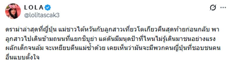 - ดราม่าล่าสุดที่ญี่ปุ่น แม่ชาวไต้หวันกับลูกสาวเที่ยวโตเกียวคืนสุดท้ายก่อนกลับ พาลูกสาวไปเดินข้ามถนนที่แยกชิบูย่า แต่ดันมีมนุษย์ป้าที่ไหนไม่รู้เดินมาชนอย่างแรง ผลักเด็กจนล้ม จะเหยียบตีนแม่ซ้ำด้วย เคยเห็นว่ามันจะมีพวกคนญี่ปุ่นที่ชอบชนคนอื่นแบบตั้งใจ