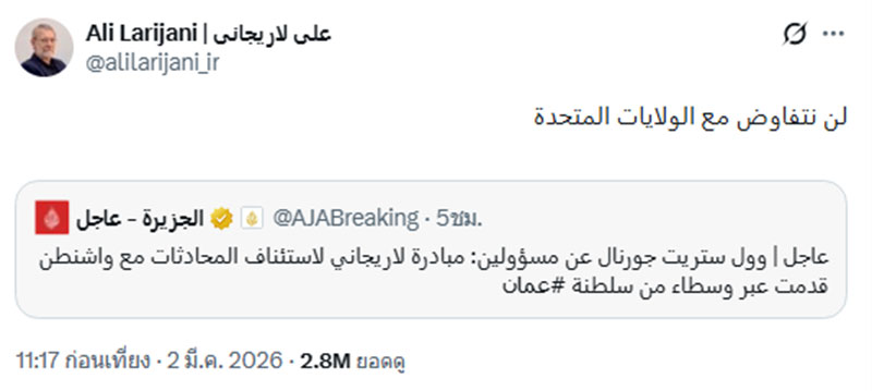 2 มีนาคม 2569 สำนักข่าวต่างประเทศรายงานว่า อาลี ลาริจานี (Ali Larijani) เลขาธิการสภาความมั่นคงสูงสุดของอิหร่าน และเขายังเป็นที่ปรึกษาคนสำคัญของ อยาตอลลาห์ อาลี คาเมเนอี ผู้นำสูงสุดของอิหร่าน ได้ออกมาโพสต์ข้อความผ่านทางเอ็กซ์ @alilarijani_ir เป็นภาษาอาหรับว่า "จะไม่เจรจากับสหรัฐอเมริกา" และ "อิหร่านไม่ได้เป็นฝ่ายเริ่มการรุกรานก่อน" หลังจากที่มีรายงานข่าวว่า อิหร่านได้ติดต่อสหรัฐฯ ผ่านตัวกลางเพื่อขอให้กลับมาเจรจาอีกครั้ง