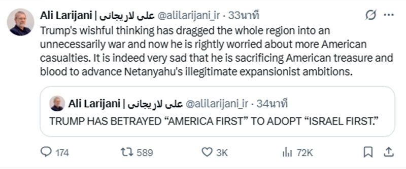 'อาลี ลาริจานี' ยังได้โพสต์ต่ออีกว่า ความคิดเพ้อฝันของประธานาธิบดีโดนัลด์ ทรัมป์ ของสหรัฐ ได้ลากทั้งภูมิภาคเข้าสู่สงครามที่ไม่จำเป็น และตอนนี้เขากังวลอย่างถูกต้องเกี่ยวกับความสูญเสียของชาวอเมริกันที่เพิ่มมากขึ้น เป็นเรื่องน่าเศร้าอย่างยิ่งที่เขาต้องเสียสละสมบัติและเลือดเนื้อของชาวอเมริกันเพื่อผลักดันความทะเยอทะยานในการขยายอำนาจที่ไม่ชอบธรรมของเนทันยาฮู