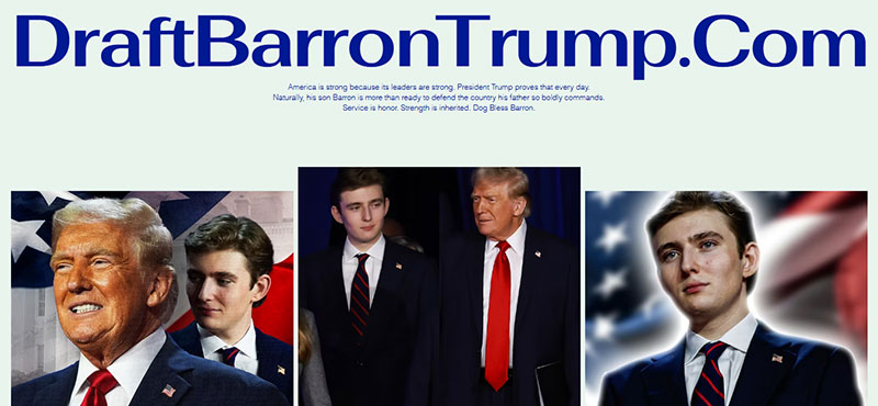 บนหน้าเว็บไซต์ได้เลียนแบบโปสเตอร์โฆษณาเกณฑ์ทหาร พร้อมข้อความเสียดสีว่า "อเมริกาเข้มแข็งเพราะผู้นำเข้มแข็ง ประธานาธิบดีทรัมป์พิสูจน์ให้เห็นทุกวัน และแน่นอนว่า บาร์รอน บุตรชายของเขาก็พร้อมที่จะปกป้องประเทศที่บิดาของเขาปกครองอย่างกล้าหาญ การรับใช้คือเกียรติ ความแข็งแกร่งสืบทอดทางกรรมพันธุ์ ขอให้สุนัขคุ้มครองบาร์รอน"