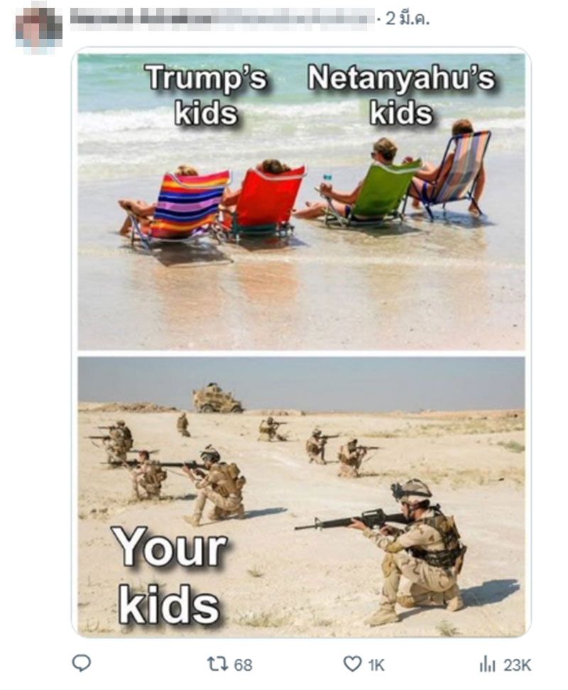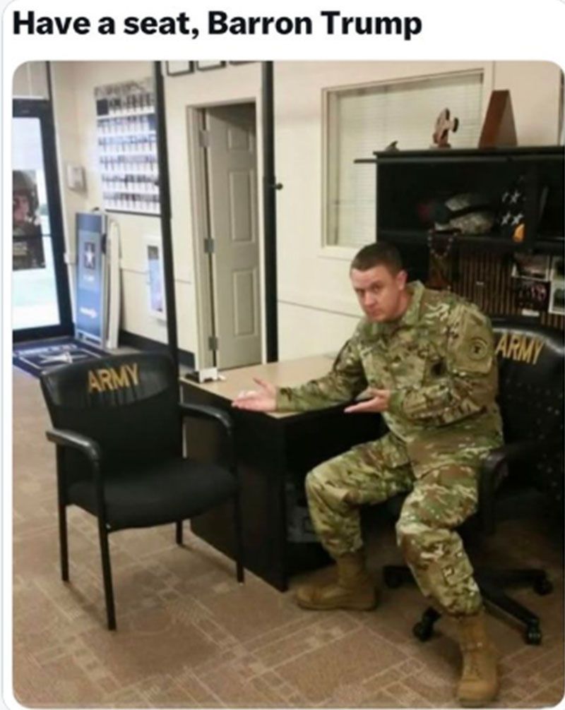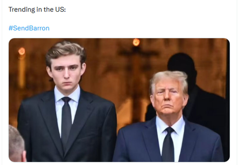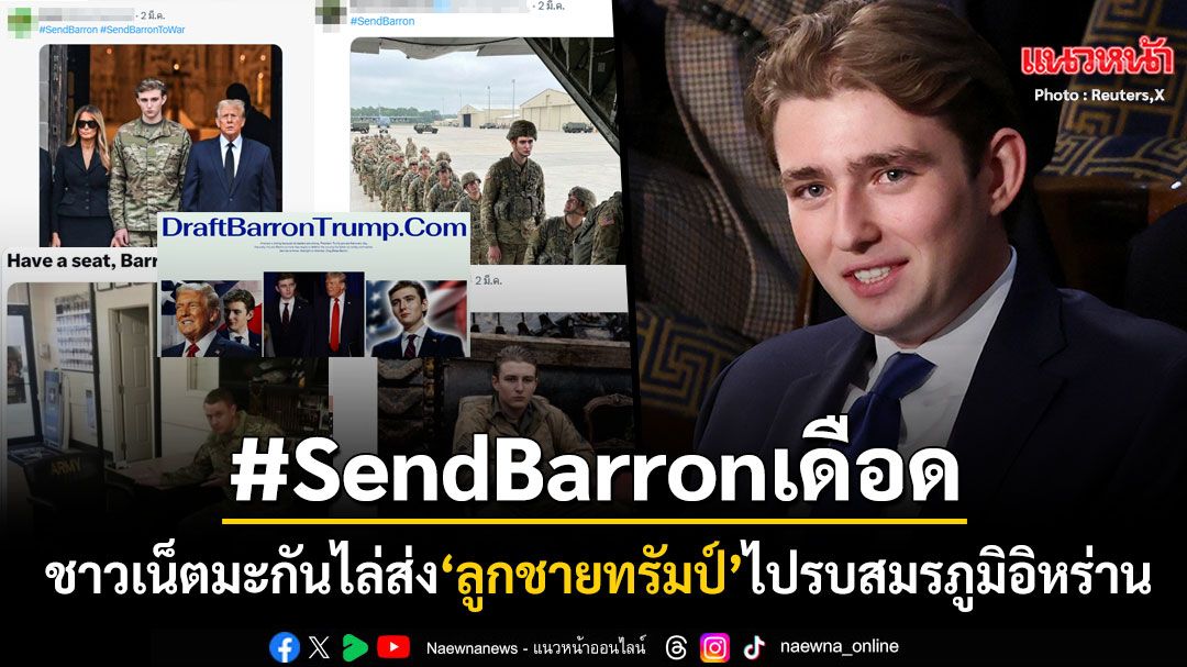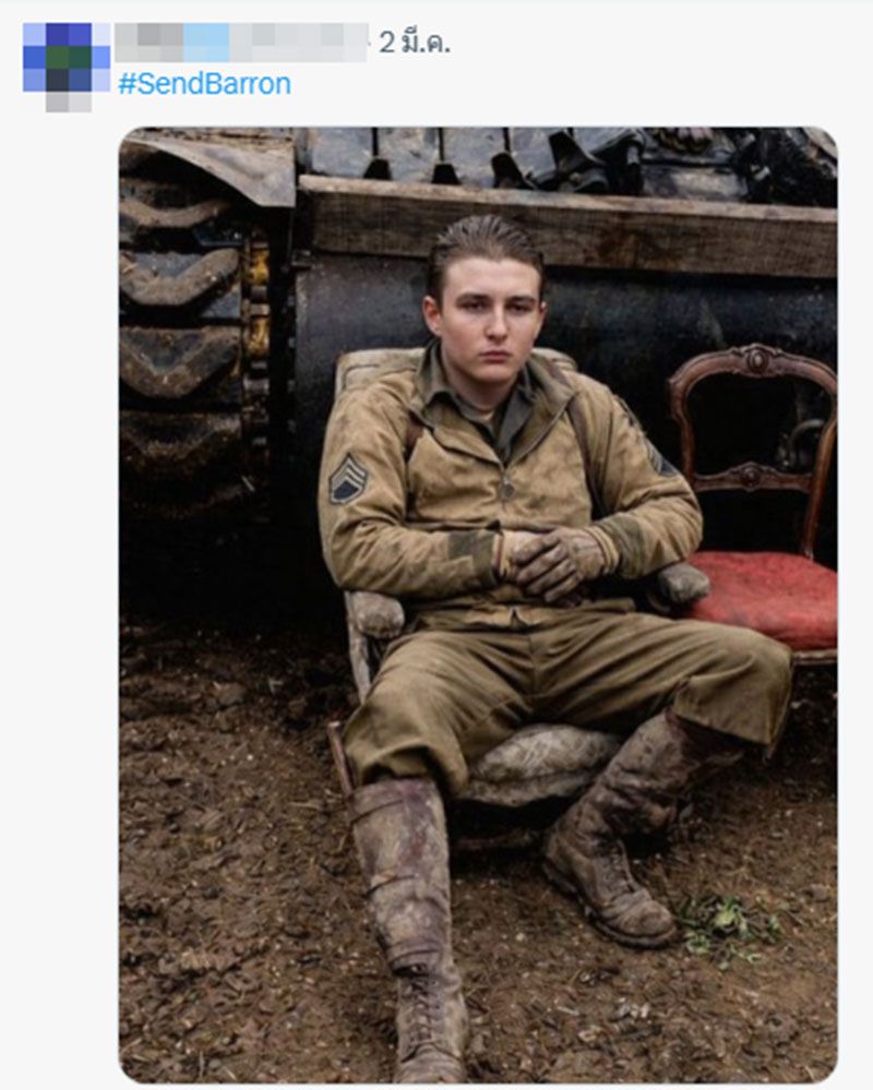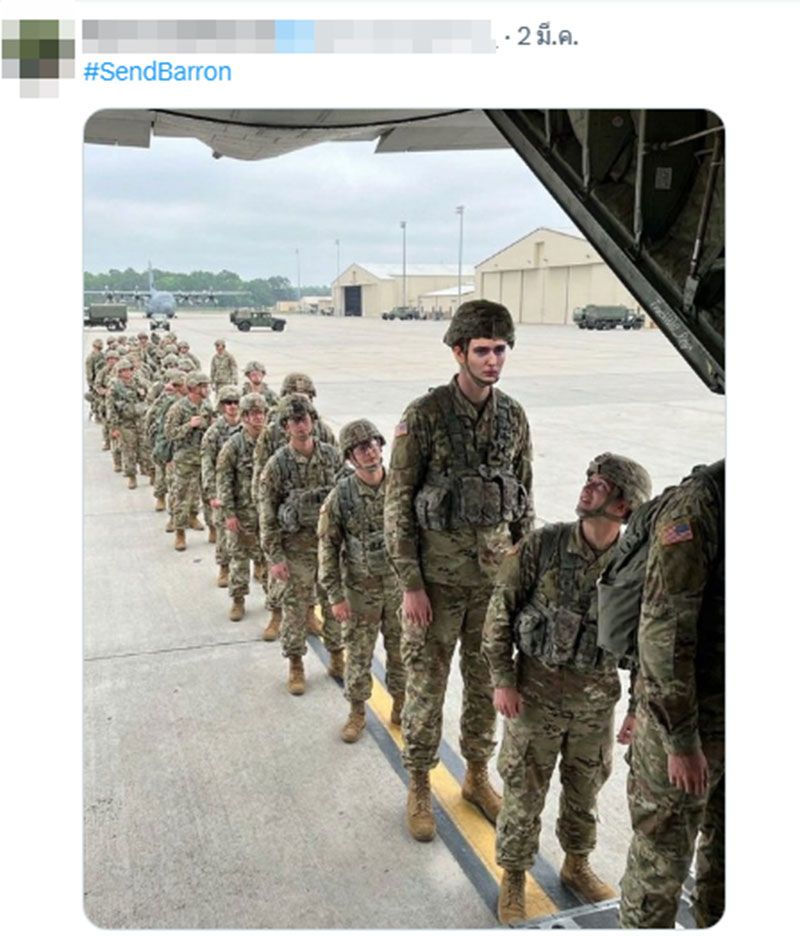โดยชาวอเมริกันพร้อมใจกันปลุกกระแสกำลังเรียกร้องให้ 'รัฐบาลทรัมป์' ส่งตัว 'บาร์รอน ทรัมป์' อายุ 19 ปี บุตรชายคนเล็กของประธานาธิบดีโดนัลด์ ทรัมป์ ไปประจำการในตะวันออกกลาง จนเกิดแฮชแท็กเดือด #SendBarron ดันพุ่งติดเทรนเอ็กซ์ในสหรัฐฯ โซเชียลมีการตัดต่อภาพของ 'บาร์รอน ทรัมป์' แต่งกายเป็นทหารอเมริกัน พร้อมทั้งแสดงความคิดเห็นวิจารณ์ถึงความสูงของเขา อาจได้รับการยกเว้นทางการแพทย์อาจทำให้เด็กหนุ่มวัย 19 ปีผู้นี้ไม่ต้องเข้ารับราชการทหาร โดยออกมาแสดงความคิดเห็น อาทิเช่น ...