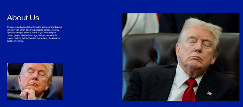เมื่อเลื่อนลงไปบนหน้าเว็บไซต์ยังปรากฎภาพ ทรัมป์ นั่งหลับ พร้อมข้อความ เว็บไซต์นี้อุทิศให้แก่ผู้ที่มีบทบาทและความกล้าหาญที่สุดในสงคราม เมื่ออำนาจถูกส่งออกไปต่างประเทศ ย่อมเป็นเรื่องถูกต้องที่ความเข้มแข็งจะต้องมีอยู่ภายในประเทศ หากคุณกำลังมองหาพันธุกรรมที่พิสูจน์แล้ว ความกล้าหาญที่สืบทอดมา และความมุ่งมั่นที่ไม่มีข้อสงสัยใดๆ ก็ไม่ต้องมองหาที่ไหนไกลไปกว่าตระกูลทรัมป์ การเป็นผู้นำเริ่มต้นจากที่ใดที่หนึ่ง