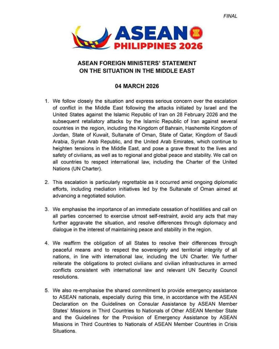 1. เราติดตามสถานการณ์อย่างใกล้ชิดและแสดงความกังวลอย่างยิ่งต่อการทวีความรุนแรงของความขัดแย้งในตะวันออกกลางภายหลังการโจมตีที่อิสราเอลและสหรัฐอเมริการิเริ่มขึ้นต่อสาธารณรัฐอิสลามอิหร่านเมื่อวันที่ 28 กุมภาพันธ์ 2569 และการโจมตีตอบโต้ในเวลาต่อมาโดยสาธารณรัฐอิสลามอิหร่านต่อหลายประเทศในภูมิภาค รวมถึงราชอาณาจักรบาห์เรน ราชอาณาจักรฮาเชมิตแห่งจอร์แดน รัฐคูเวต สุลต่านแห่งโอมาน รัฐกาตาร์ ราชอาณาจักรซาอุดีอาระเบีย สาธารณรัฐอาหรับซีเรีย และสหรัฐอาหรับเอมิเรตส์ ซึ่งยังคงเพิ่มความตึงเครียดในตะวันออกกลาง และเป็นภัยคุกคามร้ายแรงต่อชีวิตและความปลอดภัยของพลเรือน ตลอดจนสันติภาพและความมั่นคงในระดับภูมิภาคและระดับโลก เราเรียกร้องให้ทุกประเทศเคารพกฎหมายระหว่างประเทศ รวมถึงกฎบัตรสหประชาชาติ (UN Charter)