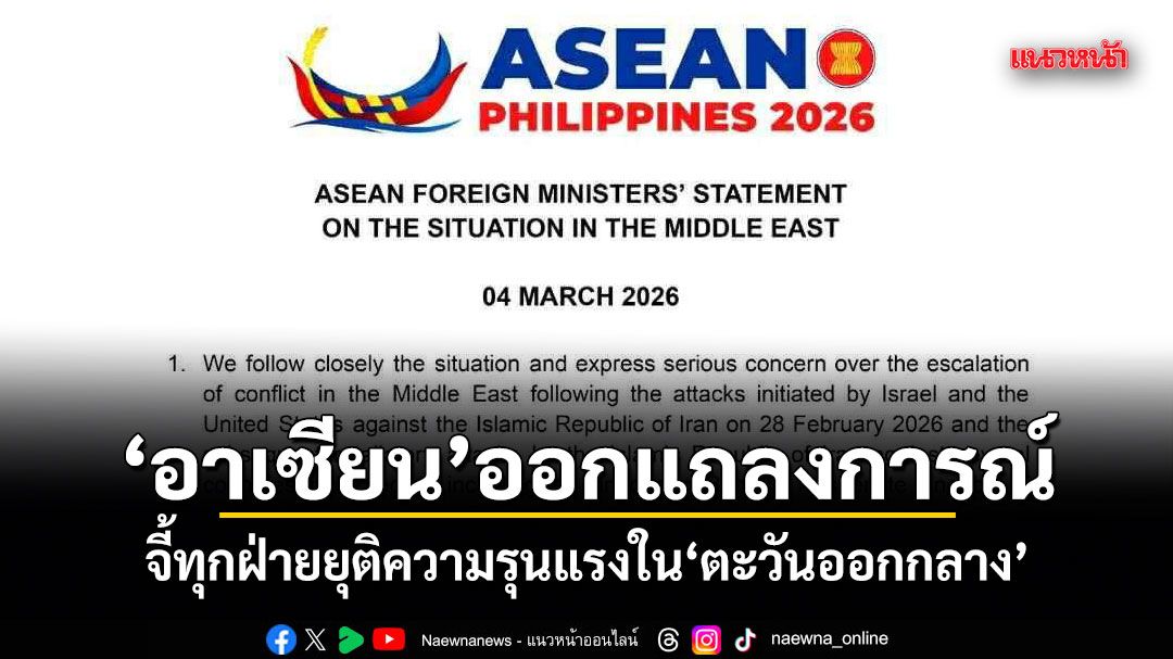 5 มีนาคม 2569 รศ.ดร.ปิติ ศรีแสงนาม ผู้อำนวยการบริหาร มูลนิธิอาเซียน ณ กรุงจาการ์ตา ประเทศอินโดนีเซีย และอาจารย์ประจำคณะเศรษฐศาสตร์ จุฬาลงกรณ์มหาวิทยาลัย โพสต์ข้อความผ่านเฟซบุ๊ก ระบุว่า อาเซียน ฟิลิปปินส์ 2026 แถลงการณ์ของรัฐมนตรีต่างประเทศอาเซียนเกี่ยวกับสถานการณ์ในตะวันออกกลาง 4 มีนาคม 2569