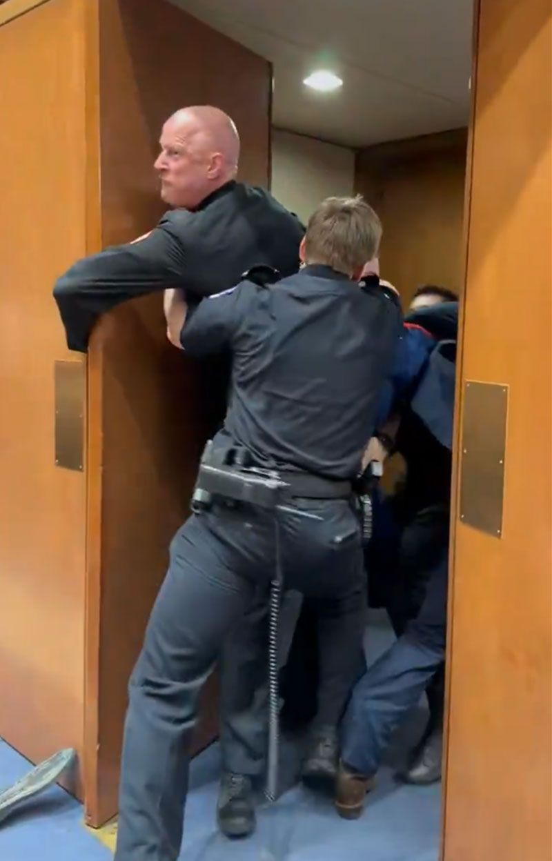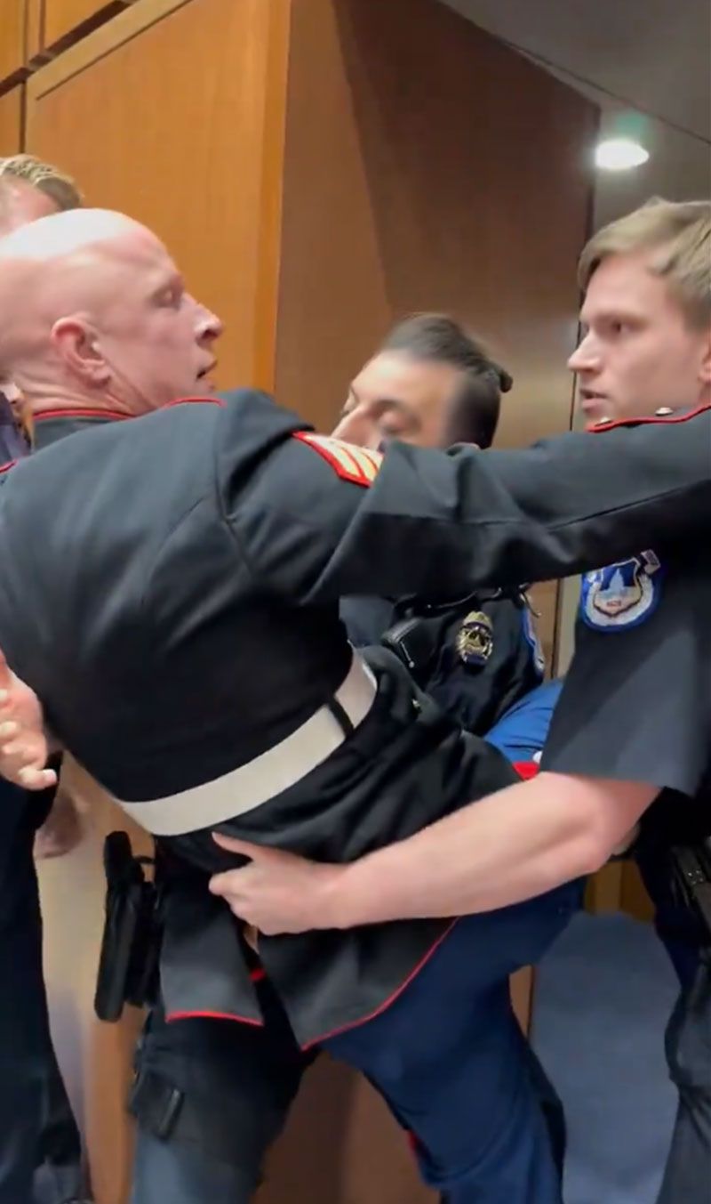 หลังจากที่ก่อเหตุในที่ประชุมอาคารรัฐสภานั้น เจ้าหน้าที่ได้เข้ามาควบคุมตัวเขาทันที และพยายามนำตัวเขาออกไปจากห้องประชุม ก่อนพบว่ามือซ้ายของเขาติดค้างอยู่ระหว่างบานประตูกับกรอบประตูและมีเสียงดังคล้ายกระดูกแตก ขณะที่ภาพวิดิโอปรากฎว่าแขนของเขาอาจหักจากเหตุชุลมุนดังกล่าว เขาขัดขืนที่จะออกไปจากที่ประชุมก่อนที่วุฒิสมาชิกชีฮีจะเข้ามาช่วยควบคุมสถานการณ์ในครั้งนี้