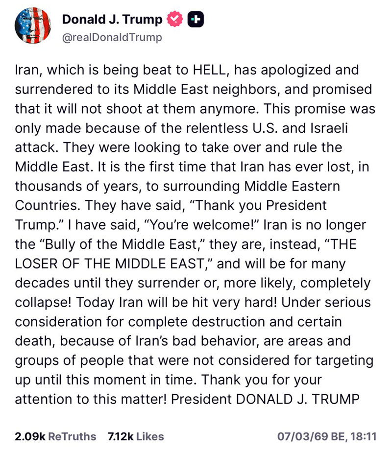 ล่าสุดประธานาธิบดีโดนัลด์ ทรัมป์ ของสหรัฐ ได้ออกมาโพสต์ข้อความผ่านทางทรูธ โซเชียลส่วนตัว "@RealDonaldTrump" ระบุว่า อิหร่าน ซึ่งกำลังถูกโจมตีอย่างหนัก ได้ออกมาขอโทษและยอมจำนนต่อประเทศเพื่อนบ้านในตะวันออกกลาง และให้คำมั่นว่าจะไม่ยิงใส่พวกเขาอีกต่อไป คำมั่นนี้เกิดขึ้นเพียงเพราะการโจมตีอย่างไม่ลดละจากสหรัฐฯ และอิสราเอล