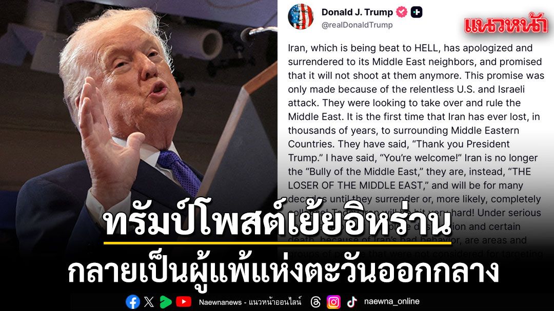 พวกเขาเคยต้องการยึดครองและปกครองตะวันออกกลาง นี่เป็นครั้งแรกในรอบหลายพันปีที่อิหร่านพ่ายแพ้ต่อประเทศรอบข้างในตะวันออกกลาง พวกเขาได้กล่าวว่า “ขอบคุณ ประธานาธิบดีทรัมป์” และผมก็ตอบไปว่า “ไม่เป็นไร!”