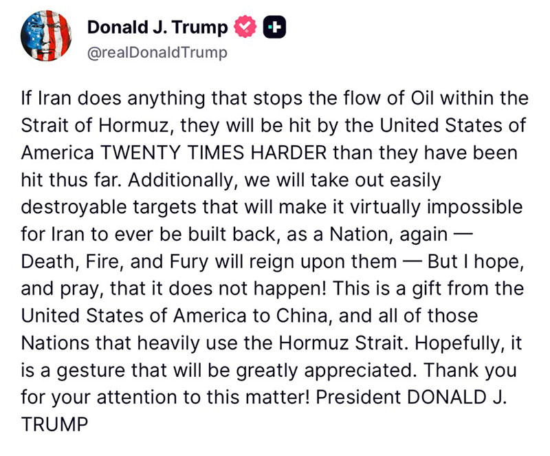 10 มีนาคม 2569 สำนักข่าวต่างประเทศรายงานว่าประธานาธิบดีโดนัลด์ ทรัมป์ ของสหรัฐฯ ได้ออกมาโพสต์ข้อความผ่านทางช่องทาง ทรูธ โซเชียล ส่วนตัว "@RealDonaldTrump" ระบุข้อความพร้อมปักหมุดว่า "หากอิหร่านทำสิ่งใดก็ตามที่หยุดการเดินทางของน้ำมันภายในช่องแคบฮอร์มุซ พวกเขาจะถูกสหรัฐฯ โจมตีรุนแรงกว่าเดิม 20 เท่า จากที่พวกเขาได้เคยถูกโจมตีมาแล้ว