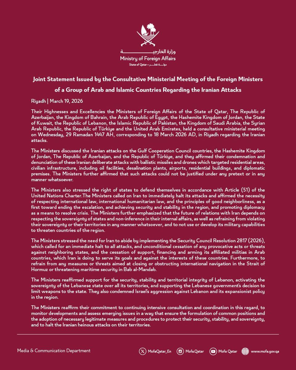 19 มีนาคม 2569 สำนักข่าวต่างประเทศรายงานว่า กลุ่มชาติอาหรับและอิสลาม ออกแถลงการณ์ ร่วมหลังการประชุมปรึกษาหารือระดับรัฐมนตรีต่างประเทศเกี่ยวกับ การโจมตีของอิหร่าน เสร็จสิ้นในวันนี้ (19 มี.ค.) ณ กรุงริยาด ประเทศซาอุดีอาระเบีย ซึ่งมีรายละเอียดดังนี้ ...