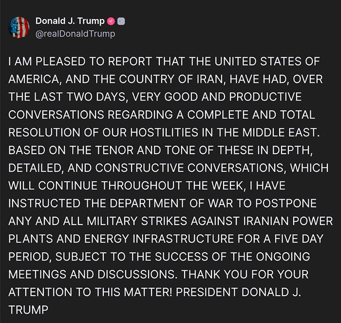 "ข้าพเจ้ายินดีที่จะรายงานถึงการพูดคุยที่ดีและสร้างสรรในช่วง 2 วันที่ผ่านมา ระหว่างสหรัฐฯ และอิหร่าน ในเรื่องยุติการเป็นปรปักษ์ต่อกันของเราในตะวันออกกลางโดยสิ้นเชิง" ผู้นำสหรัฐฯ โพสต์ข้อความใน Truth Social ชี้แจงในเรื่องเส้นตาย 48 ชั่วโมง ที่ทรัมป์ประกาศเมื่อวันอาทิตย์ 22 มี.ค.จะโจมตีโรงงานและโครงสร้างพลังงานของอิหร่าน หากอิหร่านไม่เปิดช่องแคบฮอร์มุซให้เรือขนส่งน้ำมันผ่านเข้า - ออกได้อย่างเสรี