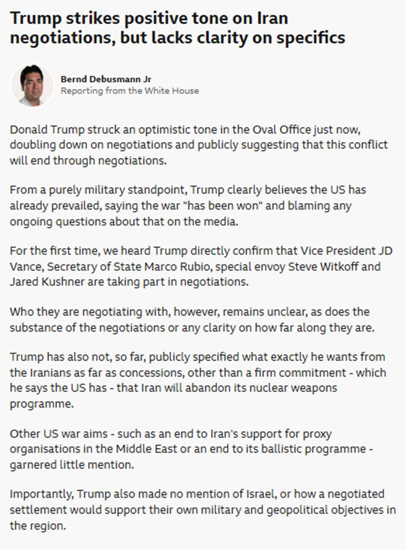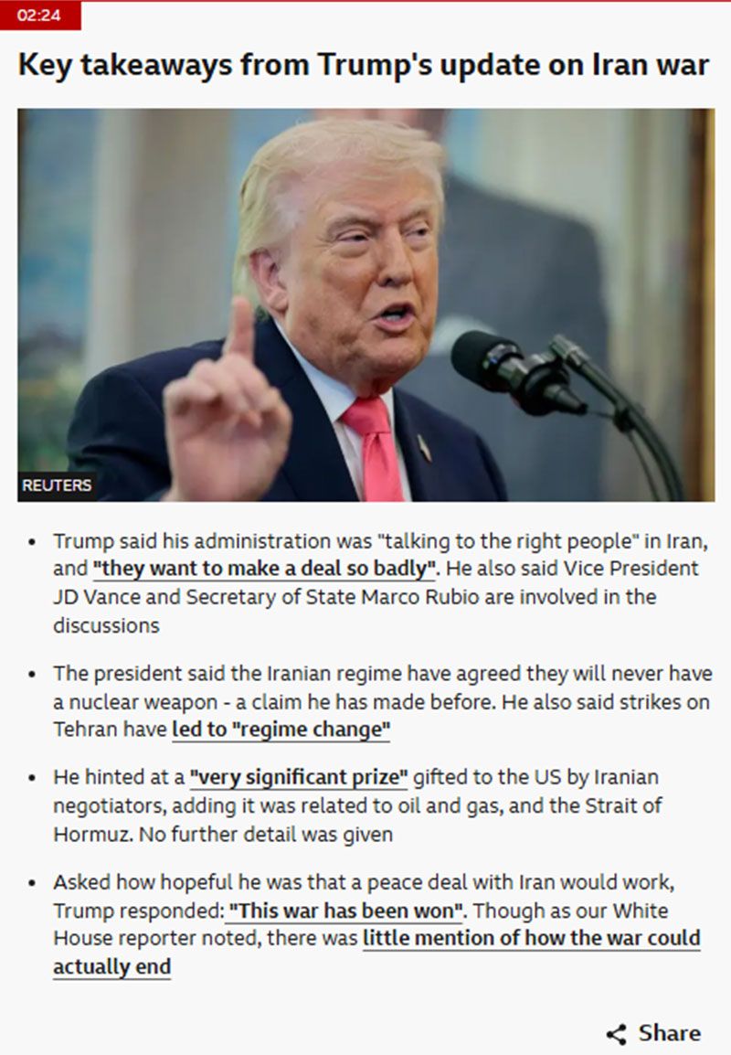 เมื่อถูกถามว่ามีความหวังมากน้อยเพียงใดว่าข้อตกลงสันติภาพกับอิหร่านจะประสบความสำเร็จ นายทรัมป์ตอบว่า 'สงครามนี้เราได้รับชัยชนะแล้ว' อย่างไรก็ตาม แทบไม่มีการกล่าวถึงรายละเอียดว่าสงครามจะสิ้นสุดลงอย่างไร
