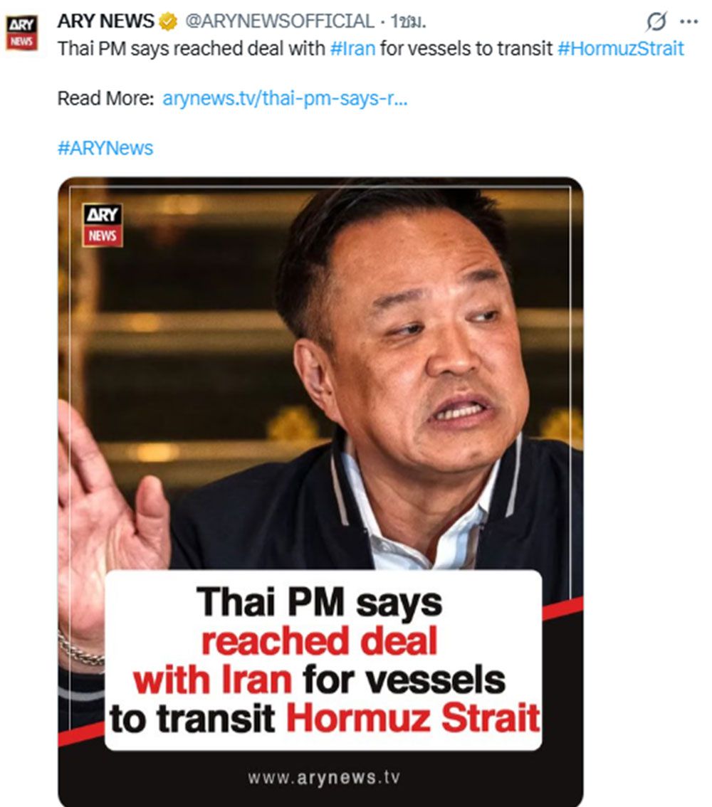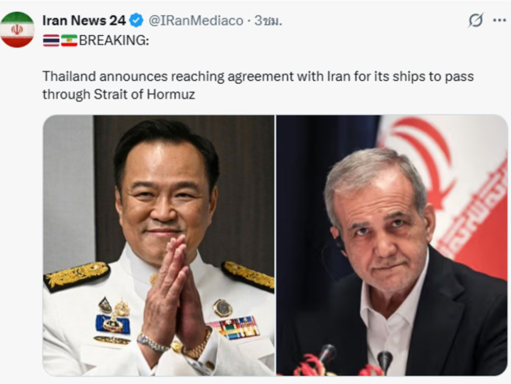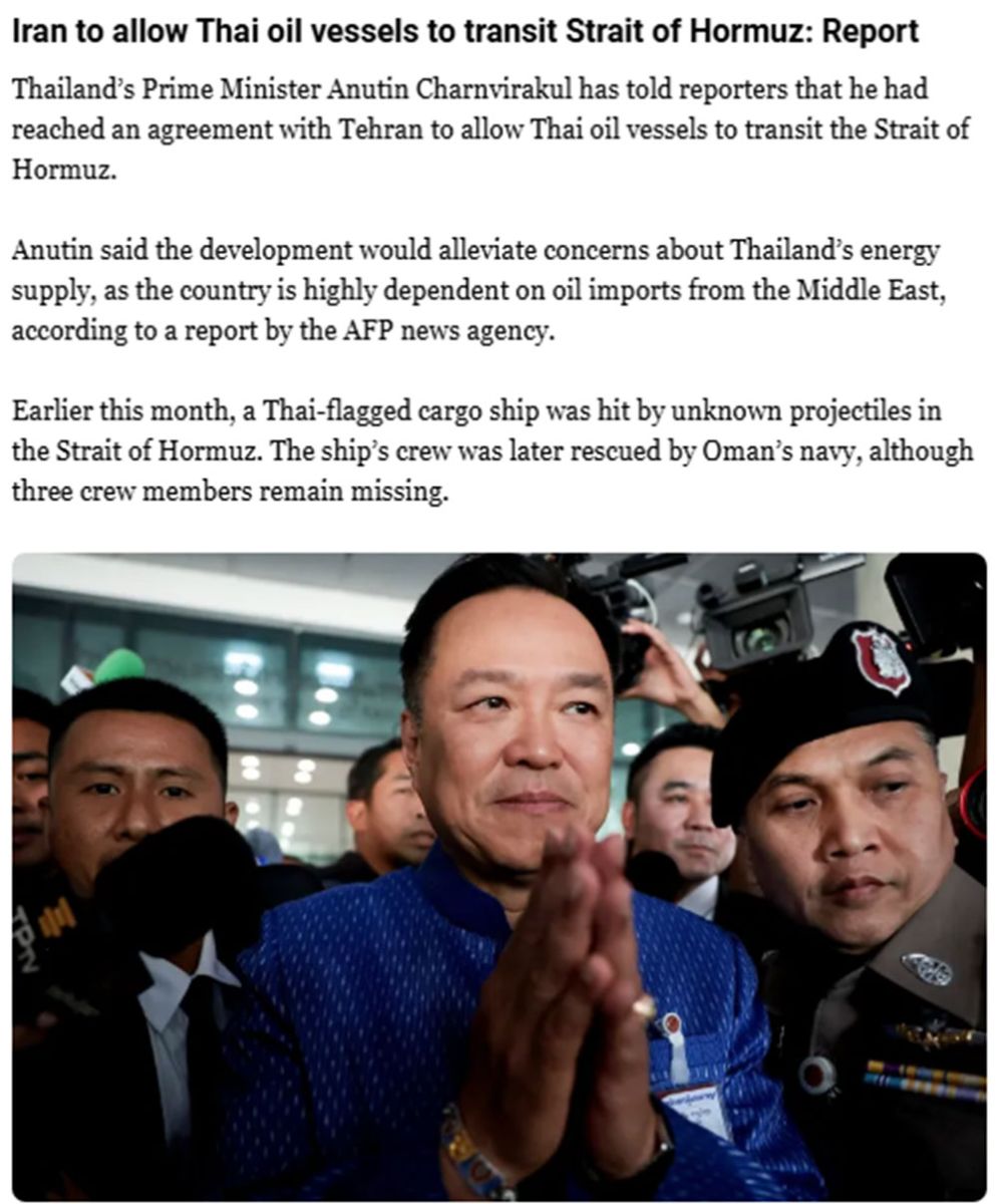 นายกฯอนุทิน กล่าวว่า เขาได้บรรลุข้อตกลงกับเตหะรานในการอนุญาตให้เรือบรรทุกน้ำมันของไทยผ่านช่องแคบฮอร์มุซได้แล้ว ความคืบหน้านี้จะช่วยบรรเทาความกังวลเกี่ยวกับแหล่งพลังงานของไทย เนื่องจากประเทศไทยพึ่งพาการนำเข้าน้ำมันจากตะวันออกกลางเป็นอย่างมาก
