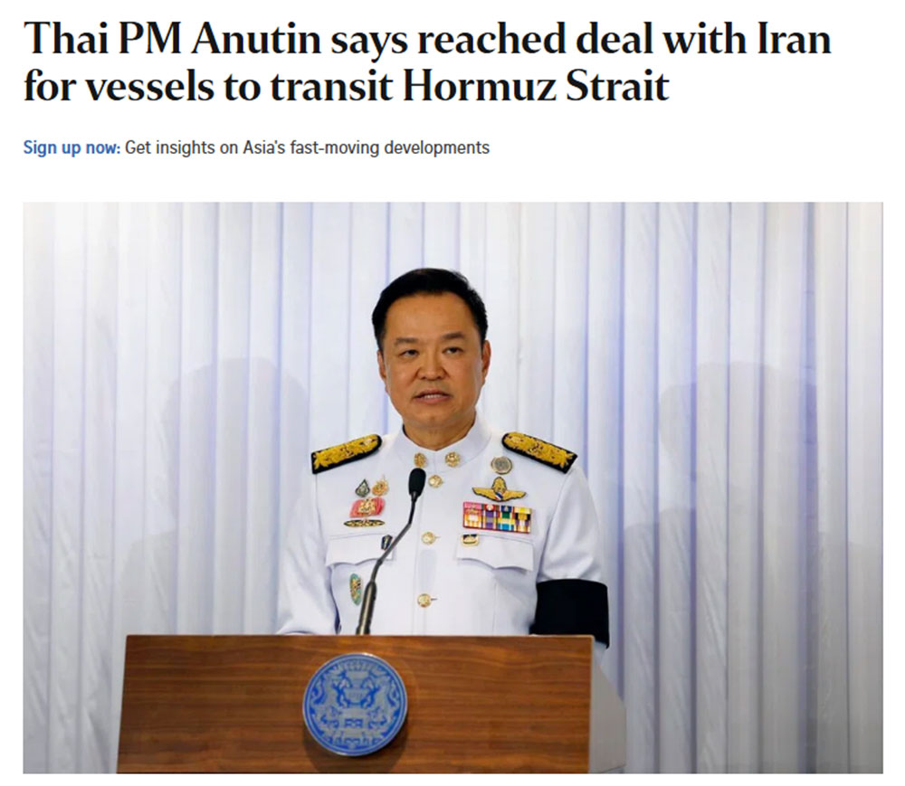 สำนักข่าว CNA - Channel News Asia ของประเทศสิงคโปร์ ได้ออกมารายงานว่า นายอนุทิน ชาญวีรกุล นายกรัฐมนตรีไทย ได้บรรลุข้อตกลงกับอิหร่านเกี่ยวกับการผ่านช่องแคบฮอร์มุซของเรือต่างๆ ด้วยข้อตกลงนี้ ทำให้มีความมั่นใจมากขึ้นว่าเหตุการณ์หยุดชะงักเช่นเดียวกับที่เกิดขึ้นเมื่อต้นเดือนมีนาคมจะไม่เกิดขึ้นอีก
