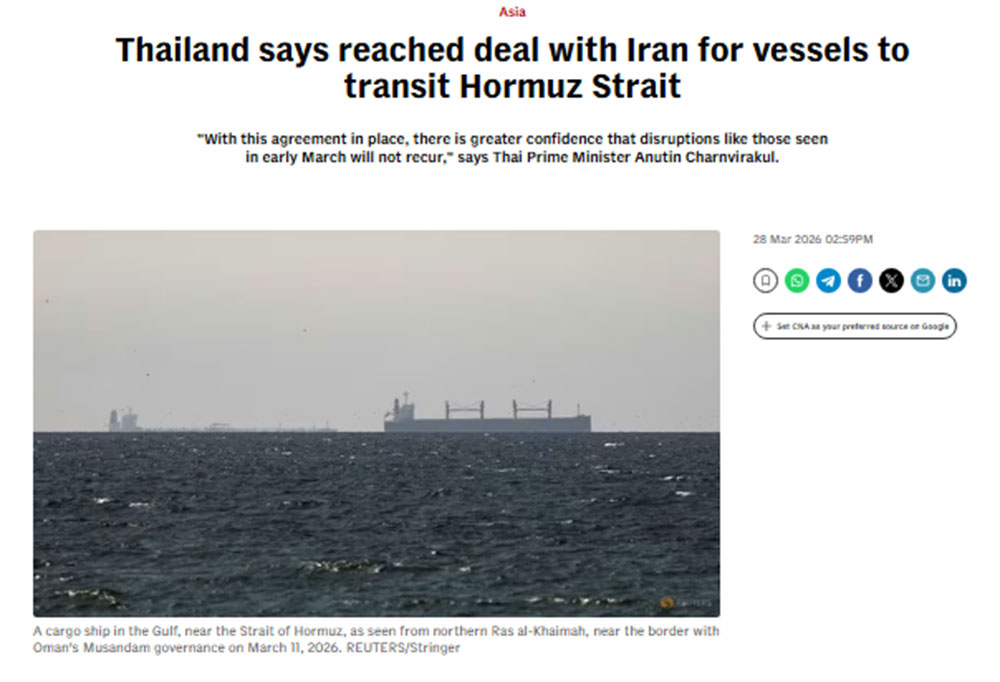 ด้านสำนักข่าว The Straits Times รายงานว่า นายกรัฐมนตรีของประเทศไทย ได้มีการบรรลุข้อตกลงที่จะอนุญาตให้เรือบรรทุกน้ำมันของไทยสามารถแล่นผ่านช่องแคบฮอร์มุซได้อย่างปลอดภัย” พร้อมเสริมว่าความคืบหน้านี้จะช่วยบรรเทาความกังวลเกี่ยวกับการนำเข้าน้ำมันเชื้อเพลิงด้วยข้อตกลงนี้ ทำให้มีความมั่นใจมากขึ้นว่าเหตุการณ์หยุดชะงักเช่นเดียวกับที่เกิดขึ้นเมื่อต้นเดือนมีนาคมจะไม่เกิดขึ้นอีก