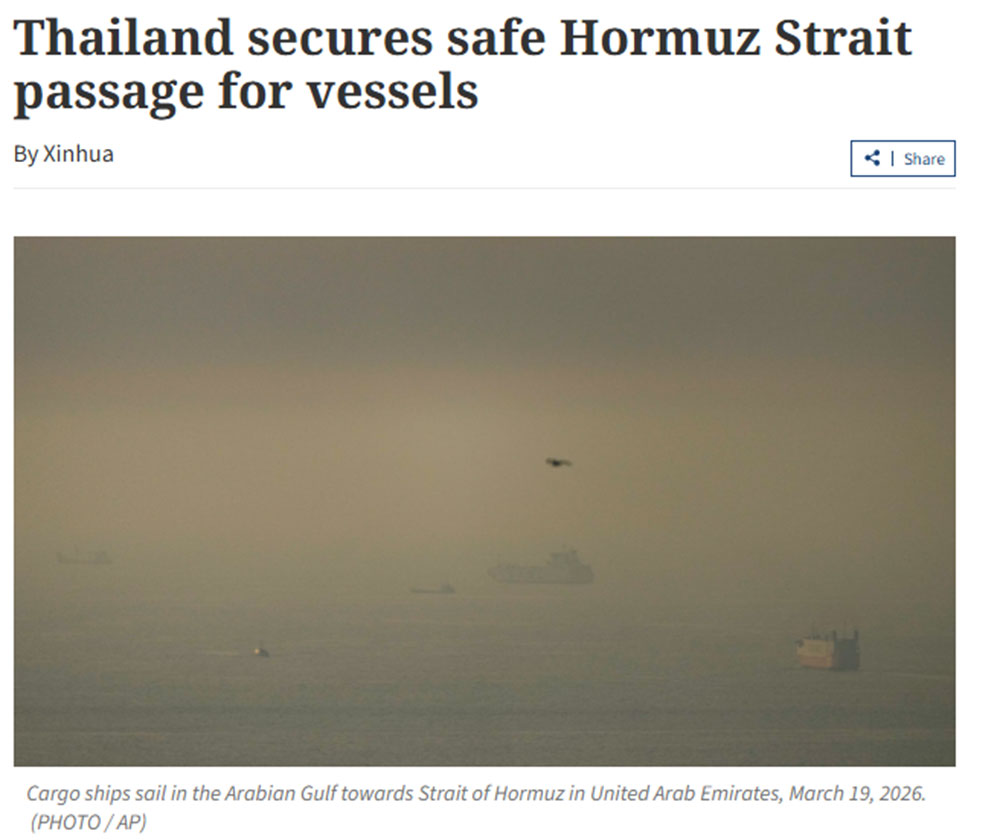 ด้าน China Daily สื่อยักษ์ใหญ่ของจีน ได้ออกมารายงานข่าวนี้เช่นเดียวกัน โดยระบุพาดหัวว่า ประเทศไทยสามารถรักษาความปลอดภัยสำหรับเรือต่างๆ ในการผ่านช่องแคบฮอร์มุซ พร้อมรายละเอียดว่า "ประเทศไทยประสบความสำเร็จในการประสานงานทางการทูตกับพันธมิตรในภูมิภาคเพื่อให้เรือบรรทุกน้ำมันสามารถผ่านช่องแคบฮอร์มุซได้อย่างปลอดภัย ซึ่งช่วยบรรเทาความกังวลเกี่ยวกับความเป็นไปได้ที่จะเกิดการหยุดชะงักของอุปทานพลังงานท่ามกลางความตึงเครียดในตะวันออกกลางตามรายงานของแผนกประชาสัมพันธ์ของรัฐบาล"