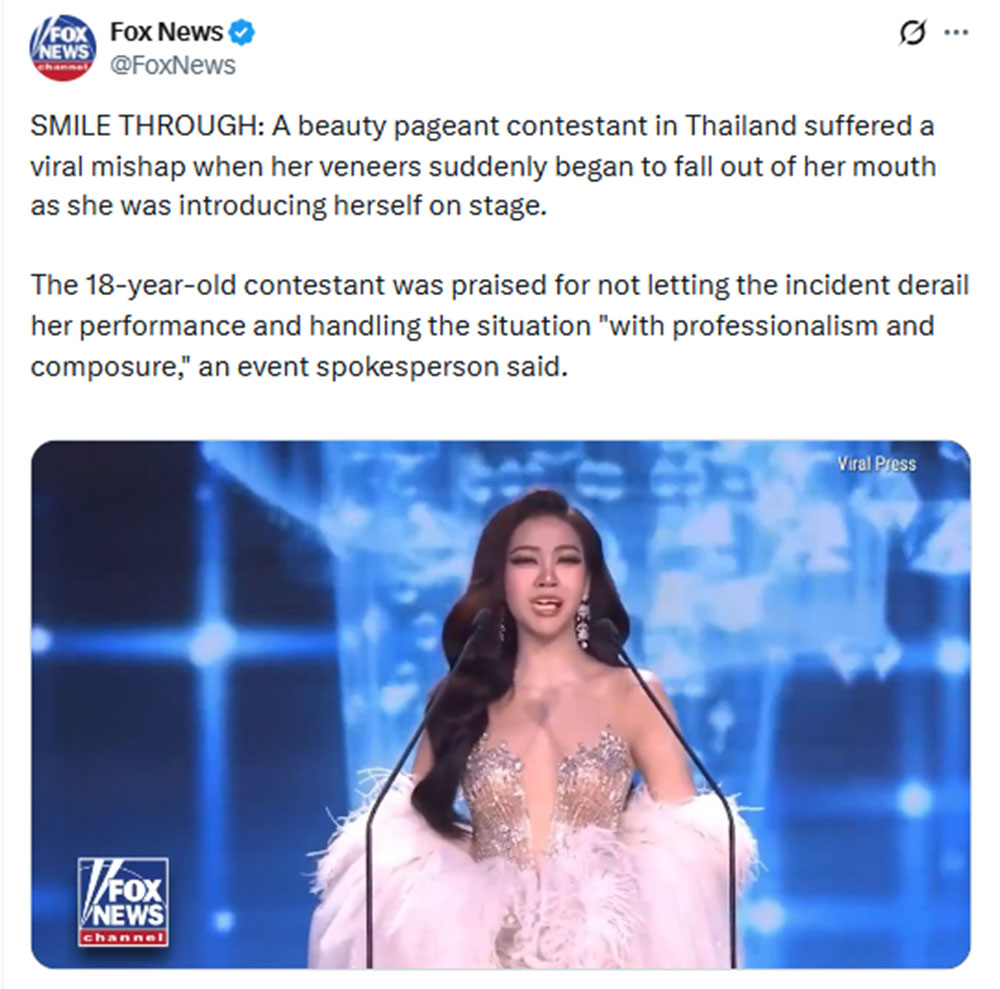 ล่าสุด สำนักข่าวต่างประเทศชื่อดังอย่าง Fox News (ฟ็อกซ์นิวส์) ได้ออกมารายงานข่าว น้องผักกาด มิสแกรนด์ปทุมธานี ระบุว่า ผู้เข้าประกวดนางงามในประเทศไทยประสบอุบัติเหตุที่กลายเป็นไวรัล เมื่อวีเนียร์ของเธอเริ่มหลุดออกมาขณะที่เธอกำลังแนะนำตัวบนเวที ผู้เข้าประกวดวัย 18 ปี ได้รับคำชมที่ไม่ปล่อยให้เหตุการณ์ดังกล่าวทำลายการแสดงของเธอ และจัดการสถานการณ์ได้อย่าง "เป็นมืออาชีพและใจเย็น"
