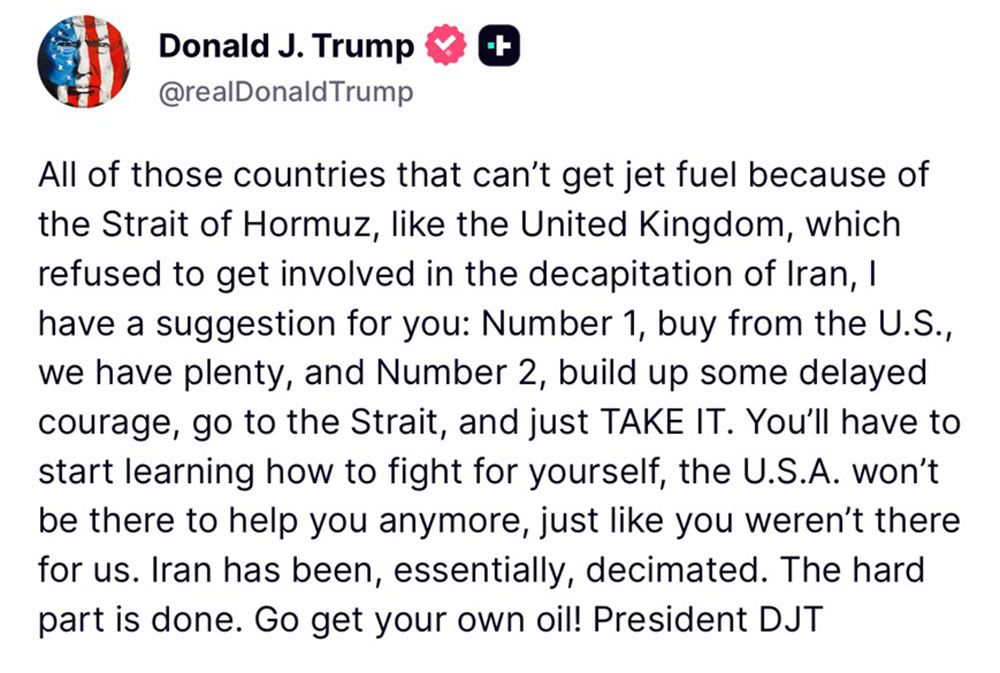 31 มีนาคม 2569 สำนักข่าวต่างประเทศรายงานว่า ประธานาธิบดีโดนัลด์ ทรัมป์ ของสหรัฐ ได้ออกมาโพสต์คลิปผ่านทางช่องทางทรูธ โซเชียลส่วนตัว "@RealDonaldTrump" ระบุข้อความว่า ประเทศทั้งหลายที่เอาน้ำมันเครื่องบินออกมาจากช่องแคบฮอร์มุซไม่ได้ เช่น สหราชอาณาจักร ซึ่งเป็นชาติปฏิเสธที่จะเข้าร่วมกับสหรัฐฯ - อิสราเอล โจมตีอิหร่าน ขอแนะนำ 2 ข้อ คือ ...