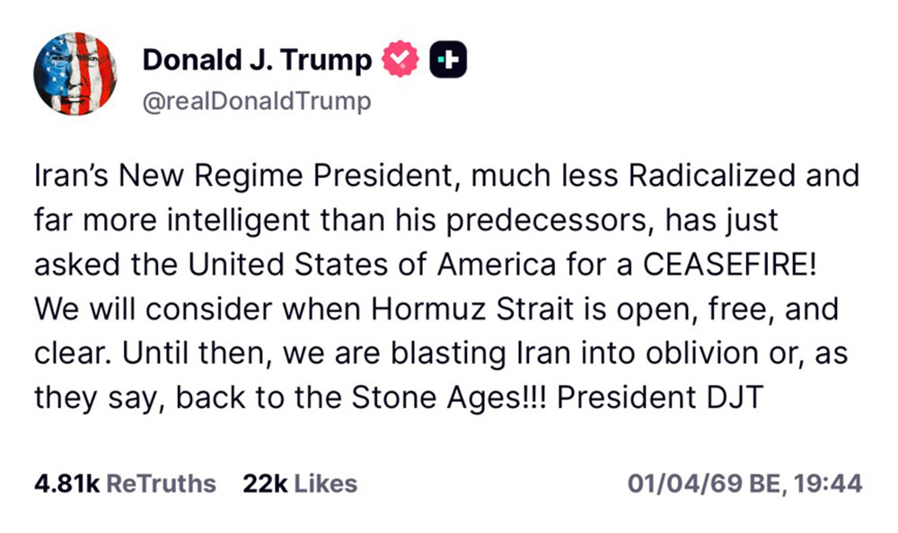 "ในระบอบการปกครองใหม่ของอิหร่านซึ่งหัวรุนแรงน้อยกว่าและฉลาดกว่ารุ่นก่อนมาก เพิ่งขอให้สหรัฐอเมริกาหยุดยิง! เราจะพิจารณาเมื่อช่องแคบฮอร์มุซเปิดอย่างอิสระ และปลอดโปร่ง จนกว่าจะถึงเวลาดังกล่าว สหรัฐกำลังระเบิดอิหร่านให้ลืมเลือนกันไปเลย หรืออย่างที่พวกเขาพูด ย้อนกลับไปในยุคหิน!!! ประธานาธิบดี DJT